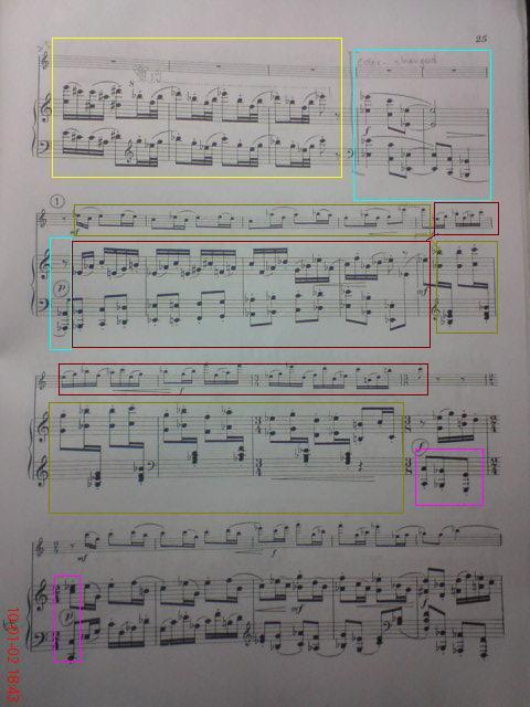 在第5小節到11小節(以及17-23小節), 有符值增長, 織度變鬆, 並且出現了半減七和弦, 改變了曲子原本光亮的色彩. 我覺得這段鋼琴可以因色可詮釋得寬闊些,像在高塔上俯望廣大的城鎮或平原.(我使用紅色) 在11小節後半到16小節(以及23-27), 可以想像兩隻站在塔上的鳥兒在對話( 鋼琴左右手呼應)(我使用亮黃色), 在16小節又回到大三和弦, 我覺得這個大三很特別~ 特別像鐘聲!! 在鳥兒吱吱喳喳, 細碎, 繁複, 高聲談論...!! 鋼琴給了長符值的音型, 帶領長笛進入. 在此, 就長笛演奏者而言, 幾乎習慣聽到左手級進的解決後吹出, 建議伴奏可以稍稍給在這段給一些顏色.(我使用 圖二 亮藍色)