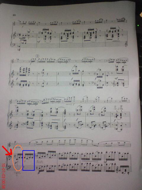 我們在合這裡的前幾次, 我都向他反應音樂有些停滯, 長笛的部份是長弦律, 我都帶不動他. 後來, 鋼琴同學經過幾番研究和嘗試, 他終於彈出了流動的感覺, 關鍵在於第一拍. 這個第一拍是十六分休止符+三個十六分音符(見橘色圈圈), 這拍不要彈得太過強調, 將重心擺在下一個拍點(第二拍, 是完整的四個十六分音符, 見深藍色框框), 將音樂的重心調整, 整個樂句就會流動囉!!
