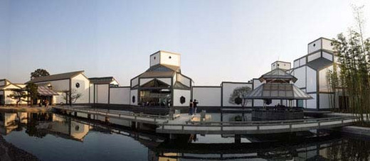 博物館外觀以灰白兩色為基本色調,正是「粉牆黛瓦」的蘇州民居常用的傳統顏色, 主體建築高度控制在