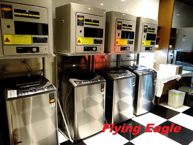 洗衣機上面是烘衣機喔,免費使用。近年我們住的台北飯店多有免費洗衣設備,最近住的柯達天津還在洗衣房裡放了乾淨的洗衣袋,讓住客裝載洗過的衣服,設想周到。