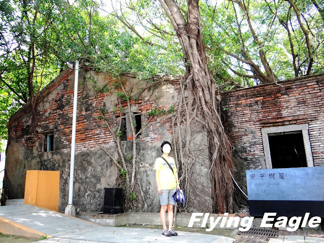 離開了四草綠色隧道,我們繼續搭台灣好行99公車往安平區。不一會兒便到了安平樹屋站,下車後走著走著標示就不見了,沿路問了幾個人才找到。安平是台灣最早開發的區域,荷蘭人在此建立市鎮,清朝時的英國領事館和各外商洋行也都設於此。安平樹屋本是英商德記洋行的倉庫,應建於19世紀末期。由於建築物荒廢經年,生長力旺盛的榕樹就登堂入室,形成屋中有樹、樹中有屋的奇景。樹屋和德記洋行以及書法家朱玖瑩的故居相鄰,被規畫為一個景區。