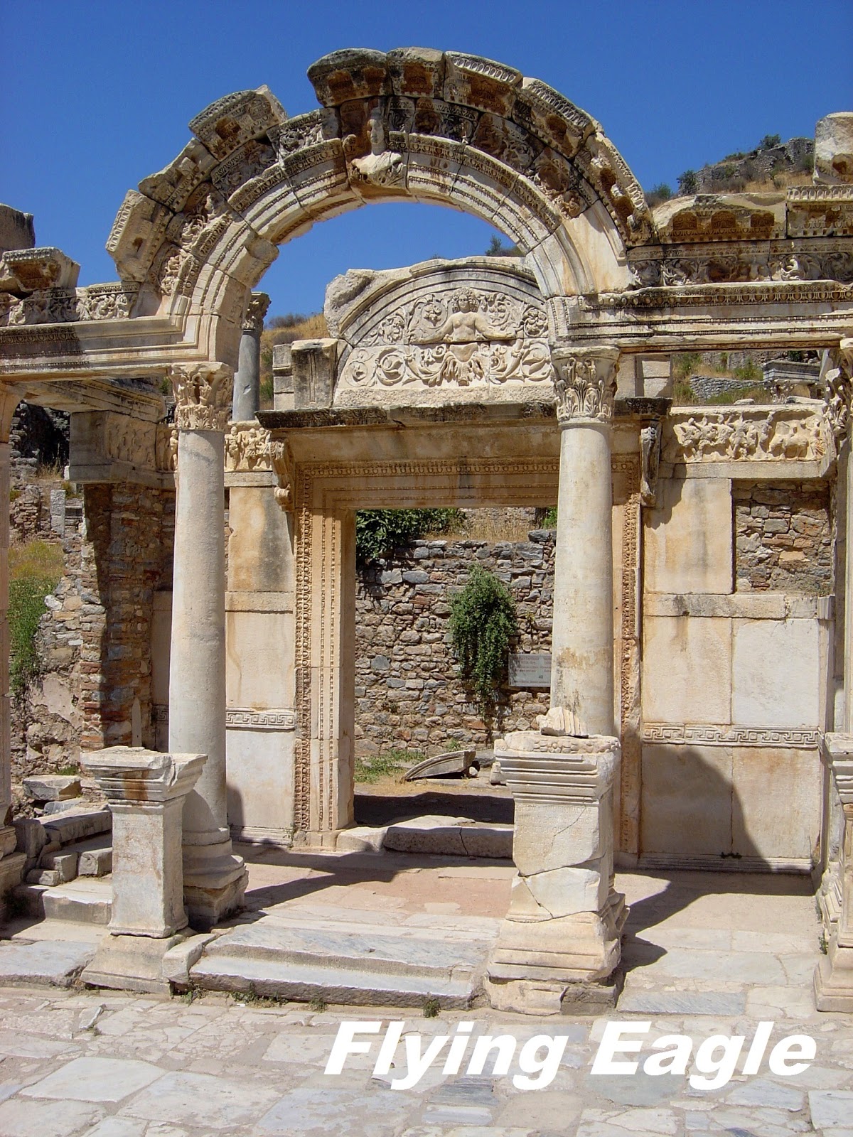 哈德良是羅馬帝國5位賢君之一。哈德良神廟(Temple of Hadrian)也位在克里特斯街,是公元2世紀的建築,從現存部分的細節可看出建築之講究。拱門正中央的雕像是以弗所的保護神Tyche,她也是神話中的幸運女神。接著來到此行最有趣的景點,只見沿著牆壁的水泥板上一個個的洞,原來是古老的公廁!在那麼多個世紀前能坐著出恭,實在是一大發明!公廁沒有隔間,想來隱私在當時並不是太大的問題。據導遊說,這是男士們聚會兼說長道短的場所。