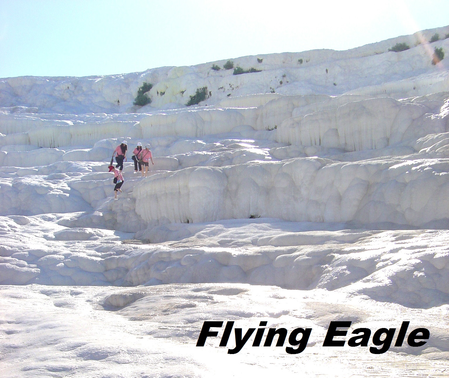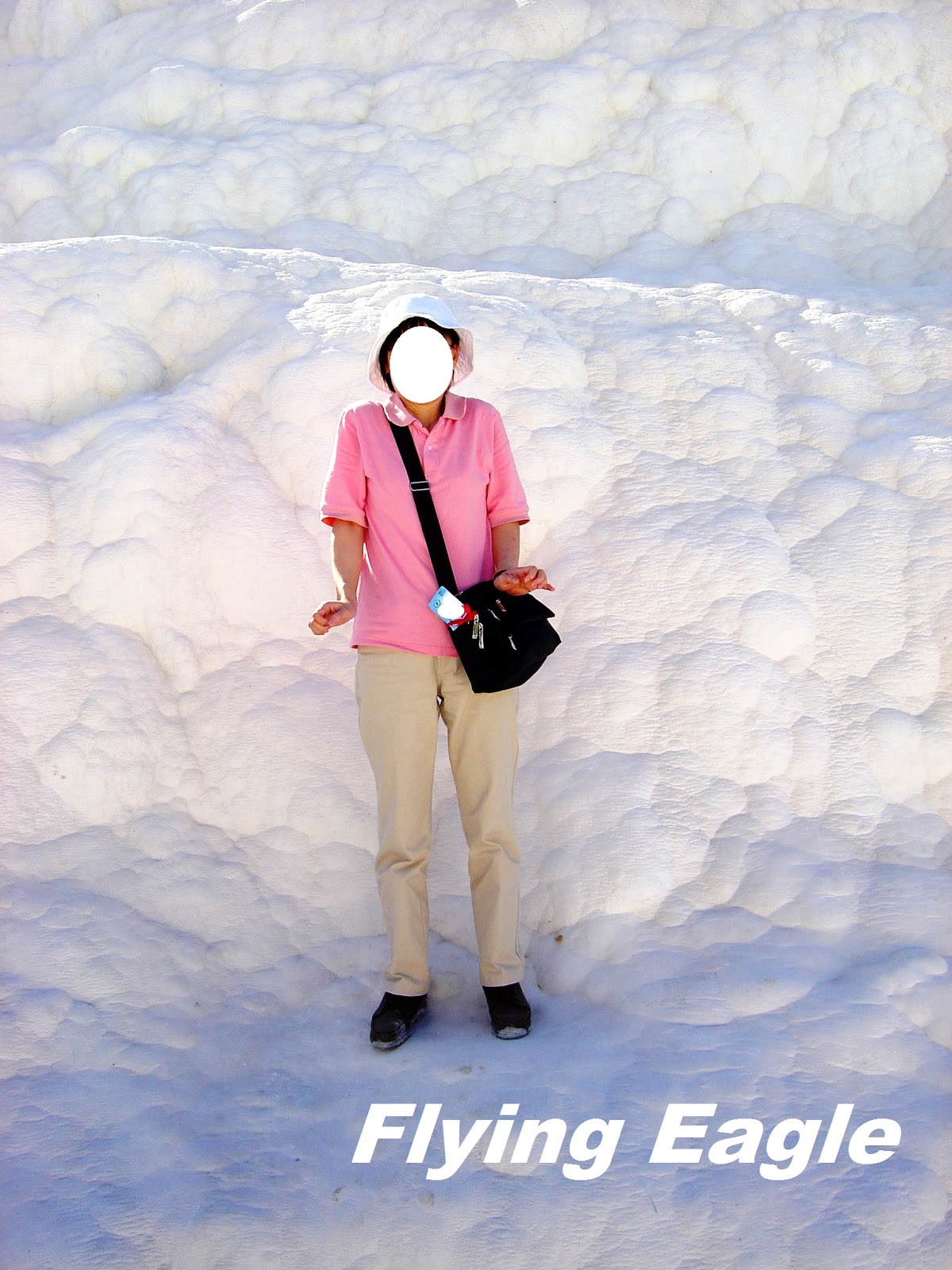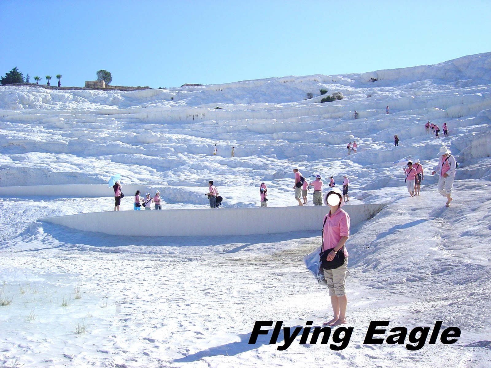 真的像雪地吧!白色的背景給人錯覺,以為很冷,其實那天很曬,戴帽子之外還得撐傘遮陽。踩在石灰岩上滑滑的,像在冰上行走。