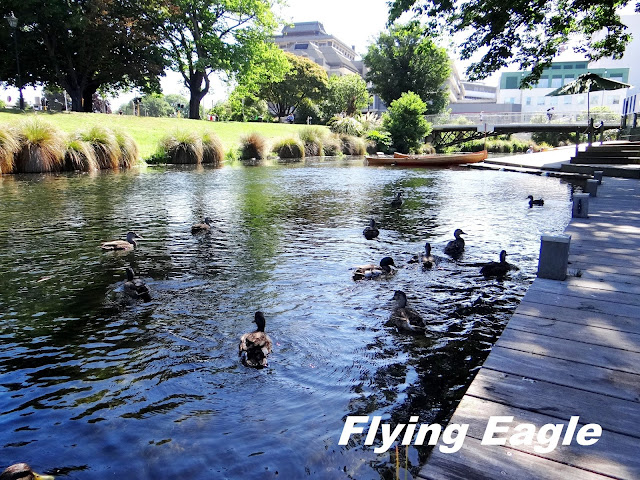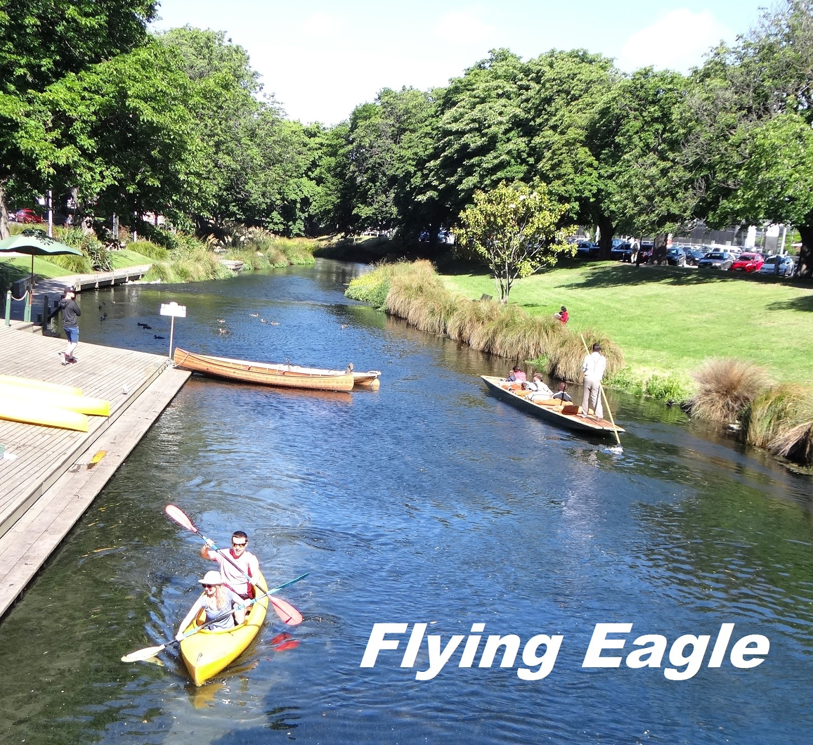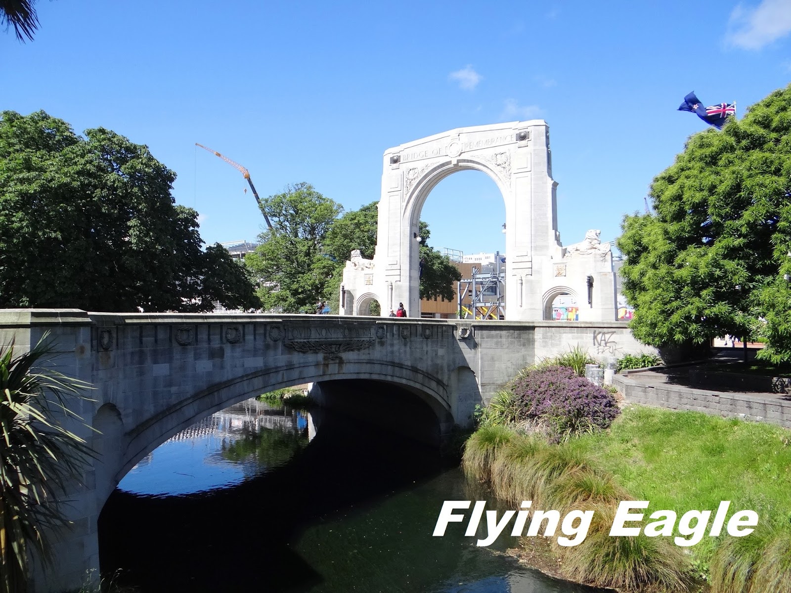貨櫃商場旁的追憶橋(Bridge of Remembrance)座落雅芳河上,於1924年啟用,為的是紀念第一次世界大戰中犧牲的紐西蘭軍人,以及之後多次戰爭中參戰的官兵。這座橋在地震中亦有毀損,但於修復後重新開放。漫步雅芳河畔,清風徐徐,十分舒爽。河面有成群結隊的鴨子,邊游水邊聒噪。河邊可租借船隻,有人划船有人撐篙,不亦樂乎!我們在橋上看見自己的河中倒影,覺得有趣,便拍下留念。