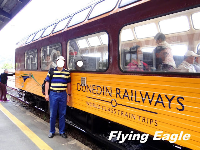 我們搭接駁車到往市區,在市中心逛了一陣後便前往但尼丁火車站。這火車站於公元1906年開始營運,曾經是紐西蘭最繁忙的火車站。它是但尼丁的熱門景點,美輪美奐的外觀像座城堡,也有許多人認為它像薑餅屋。車站大廳人來人往,其中有2位工作人員古典的裝扮與眾不同,帶出懷舊的氣氛。大廳地板是不可忽略的景致,正中央是很大的火車圖案,旁邊較小的是紐西蘭鐵路的標誌。我們選了經泰伊里峽谷(Taieri Gorge)的火車路線,來回4小時。這條路線以往載送農產品和淘金客,如今則是觀光列車,帶領遊客穿越人跡罕至的天然美景,被譽為全球最精采的火車路線之一。