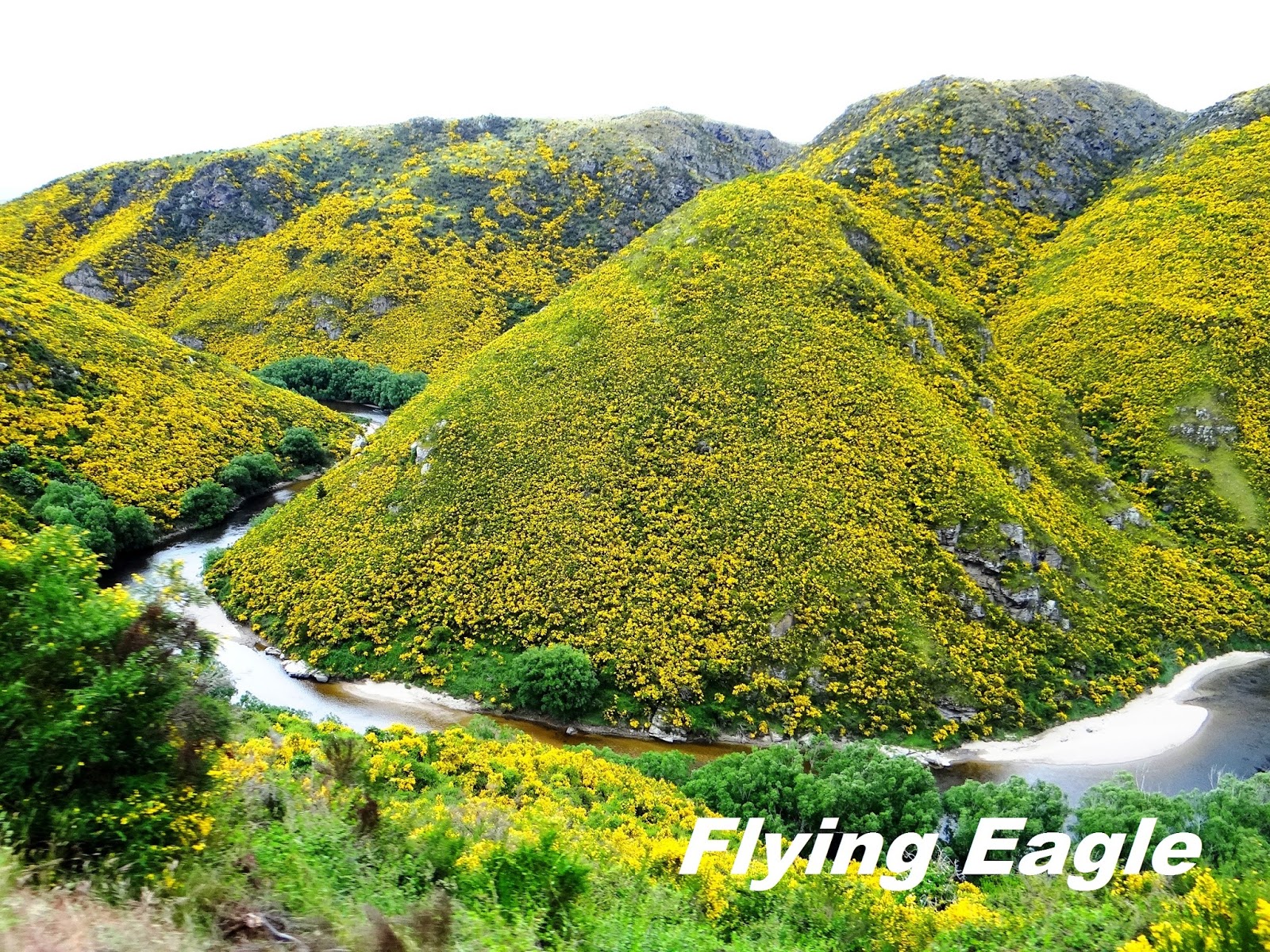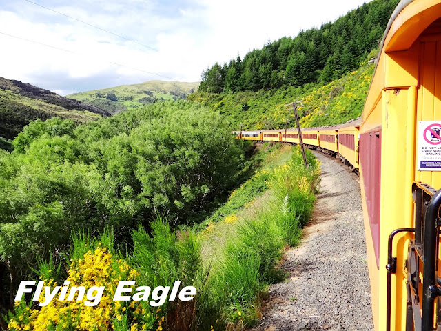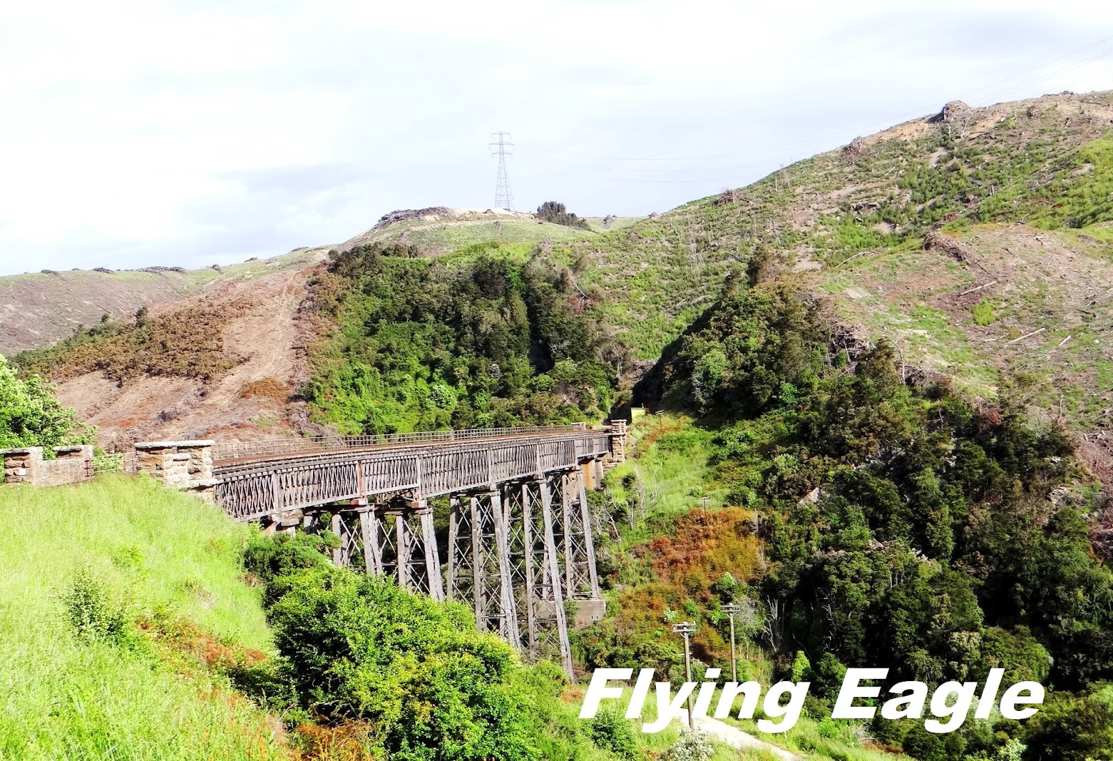 列車一路向上攀升,行經隧道橋樑、俯視溪流山谷。途中有座名為Wingatui Viaduct的高架橋,高47公尺,長197公尺,是南半球最大的高架橋,至今仍是紐西蘭最大的鐵製建物。在百餘年之前要進行如此浩大的工程,想必要克服許多困難。之後所見盡是層層疊疊的翠綠丘壑,遍野開滿了黃色的小花,四下渺無人煙,彷彿到了與世隔絕的天地。