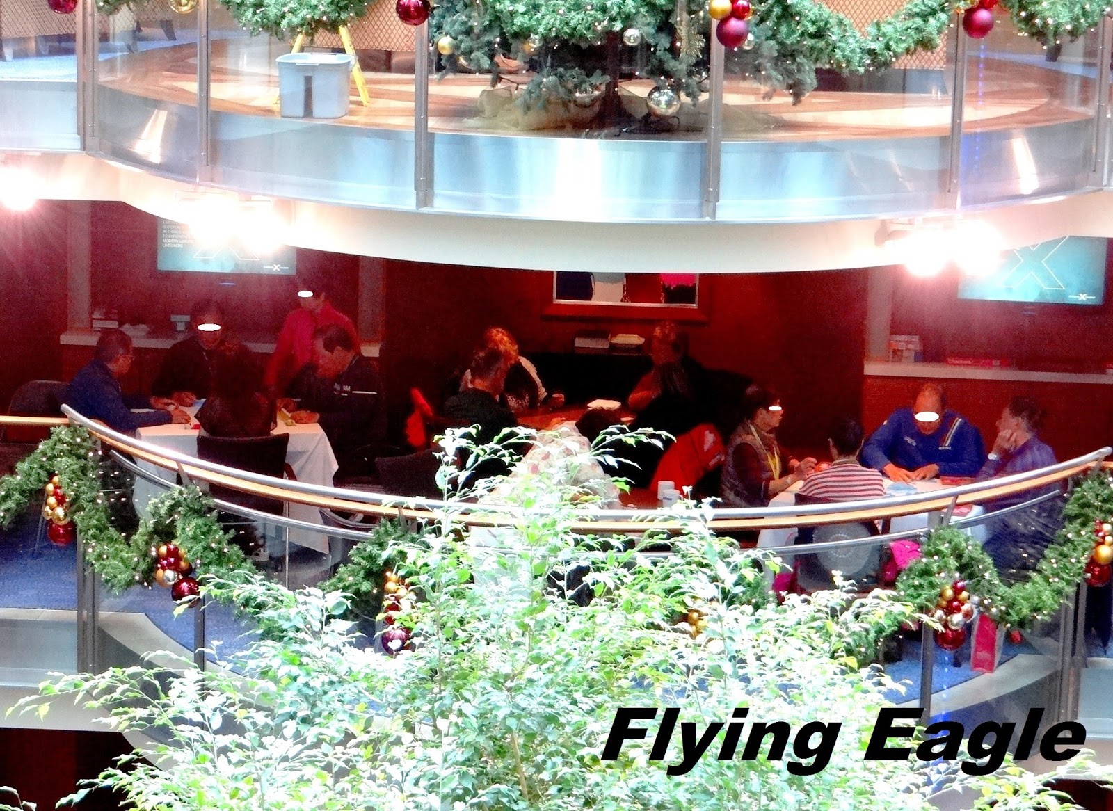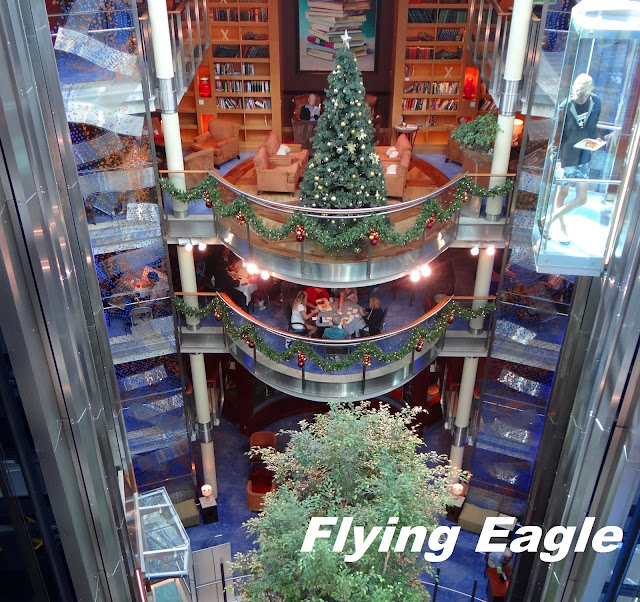 我們雖非首次搭遊輪,但仍覺得很多事情都新鮮有趣。平時從艙房裡賞景,但外遊回來從平地仰視位於11樓的艙房,則是另一視角。我們也發覺每當船啟動時,特別多海鷗在海面飛翔,很好奇是否因海水被攪動,比較容易抓到魚。船在大海航行時,遊客各自打發時間,有的在圖書館安靜看書、打盹,有的打撲克牌,有些香港的長輩則喜好方城之戰,不論何時,麻將桌總是一位難求。時值聖誕假期,船上的工作人員特別推出歌舞表演,用心可感。臨下船前一晚,他們和乘客更聚集在遊輪中庭齊唱聖誕詩歌,氣氛既熱鬧又溫馨。