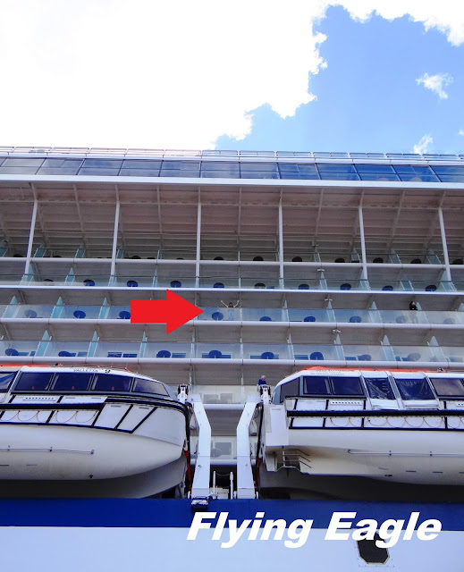 ▲從平地仰視位於11樓的艙房,看到紅箭頭指的我嗎?