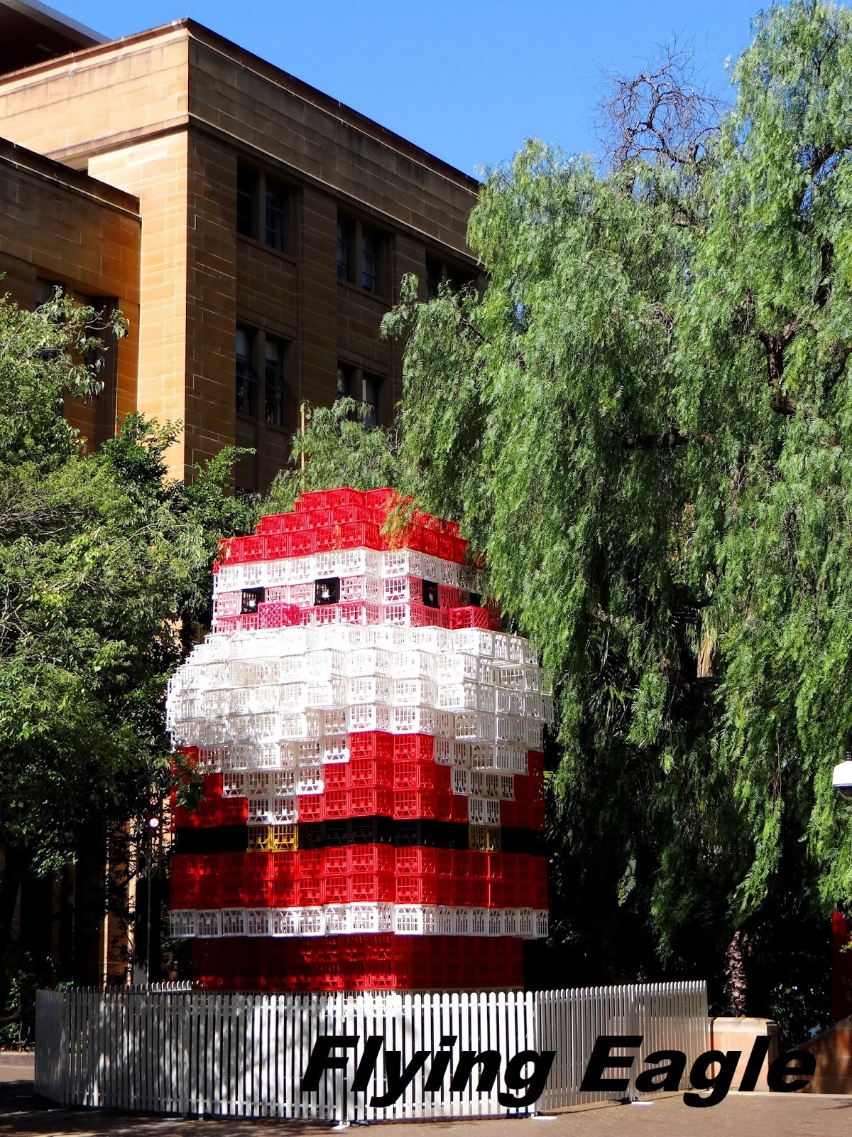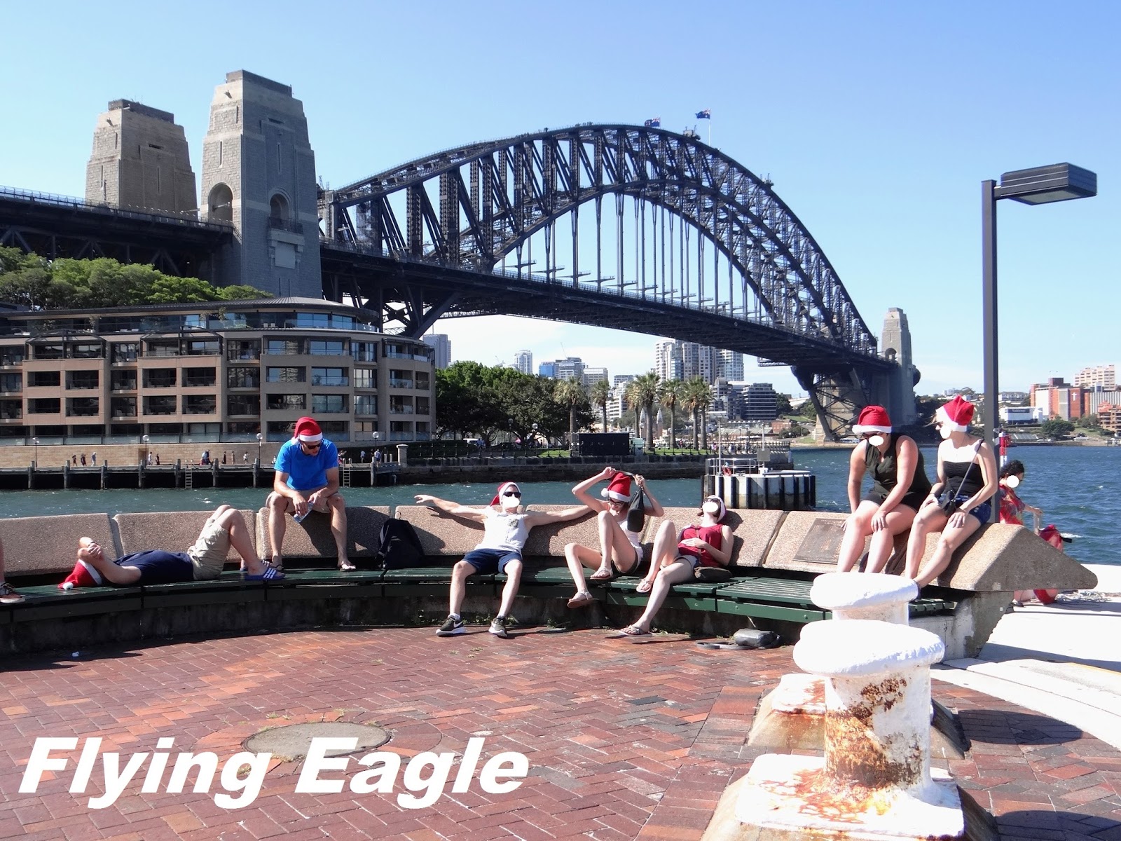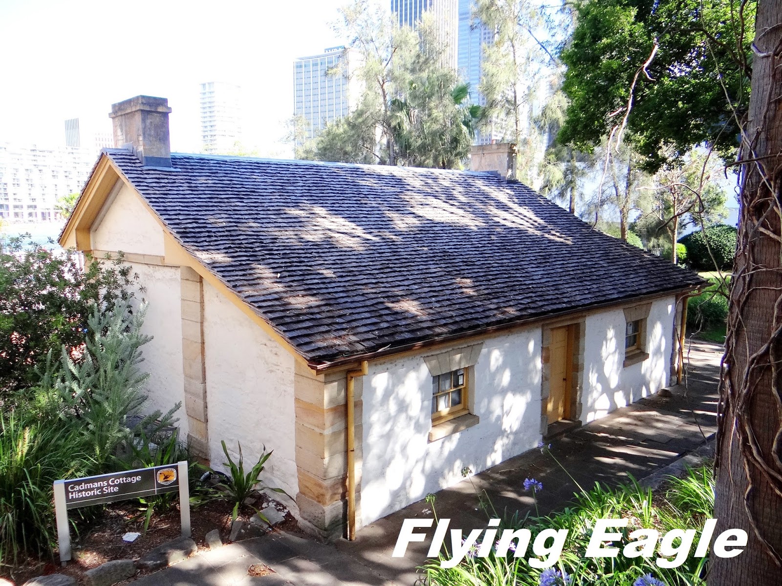 岩石區(the Rocks)是雪梨最早開發的地區,早期的建築多以砂岩為建材,因而得名。該區有較多歷史建築,每逢假日更有市集,吸引大批遊客。我們到訪時並非假日,正好避開人潮。走在路上看到巨大的聖誕老公公,時值聖誕本不足為奇,但特別的是材料是塑膠置物箱,讓人看了不覺莞爾!凱德門小屋(Cadmans Cottage)是雪梨最古老的住屋,已有兩百餘年歷史,從前為政府船員的住處。小屋以服務最久的管理員凱德門(John Cadman)命名,是澳洲現存罕有的殖民時期政府建築,別具歷史意義。