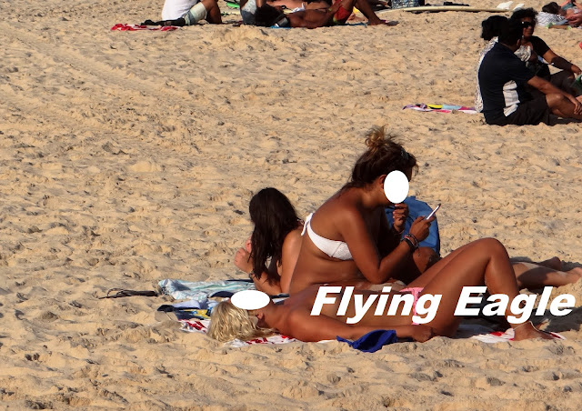 雪霏兒那位小姐不以為意的脫掉上衣,沙灘上來往的人群似乎也不以為意,反而是我小心翼翼要替她遮掩!