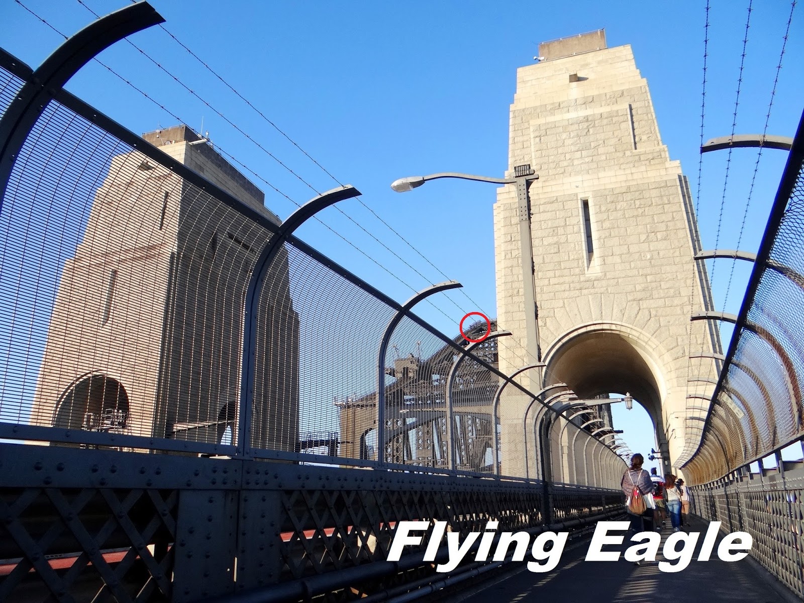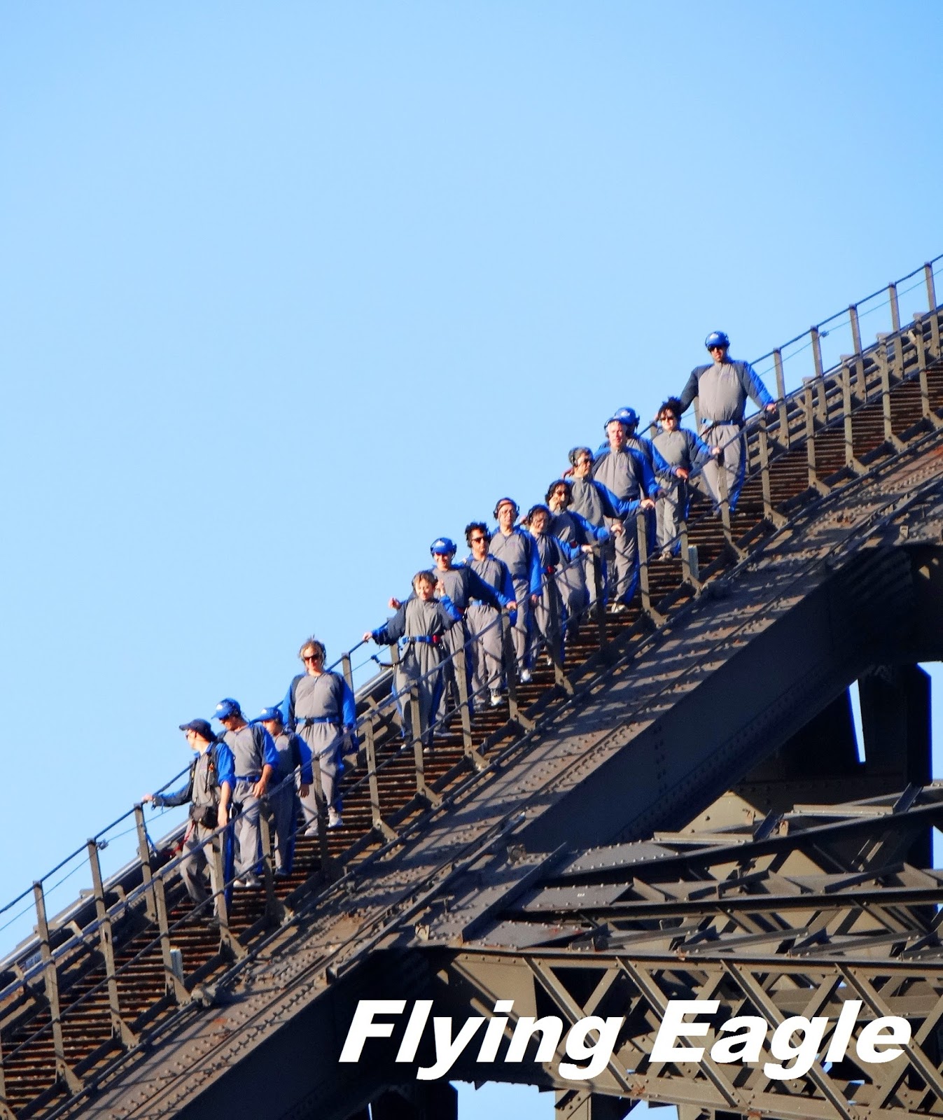 雪梨港灣大橋是全球最高的鋼鐵拱橋,從大橋最高點到海平面的距離有134公尺(440呎)。但是它最特別之處在於連橋頂都可以讓人行走,而且這還是港灣大橋的一大賣點呢!要攀登橋頂,必須穿上特殊的裝備。我們漫步橋上時,恰巧有一隊人馬正在橋頂的鋼架上,每人都戴著耳機聆聽指示,腰間並有纜繩扣住橋的鋼索,看來還真有些驚險!