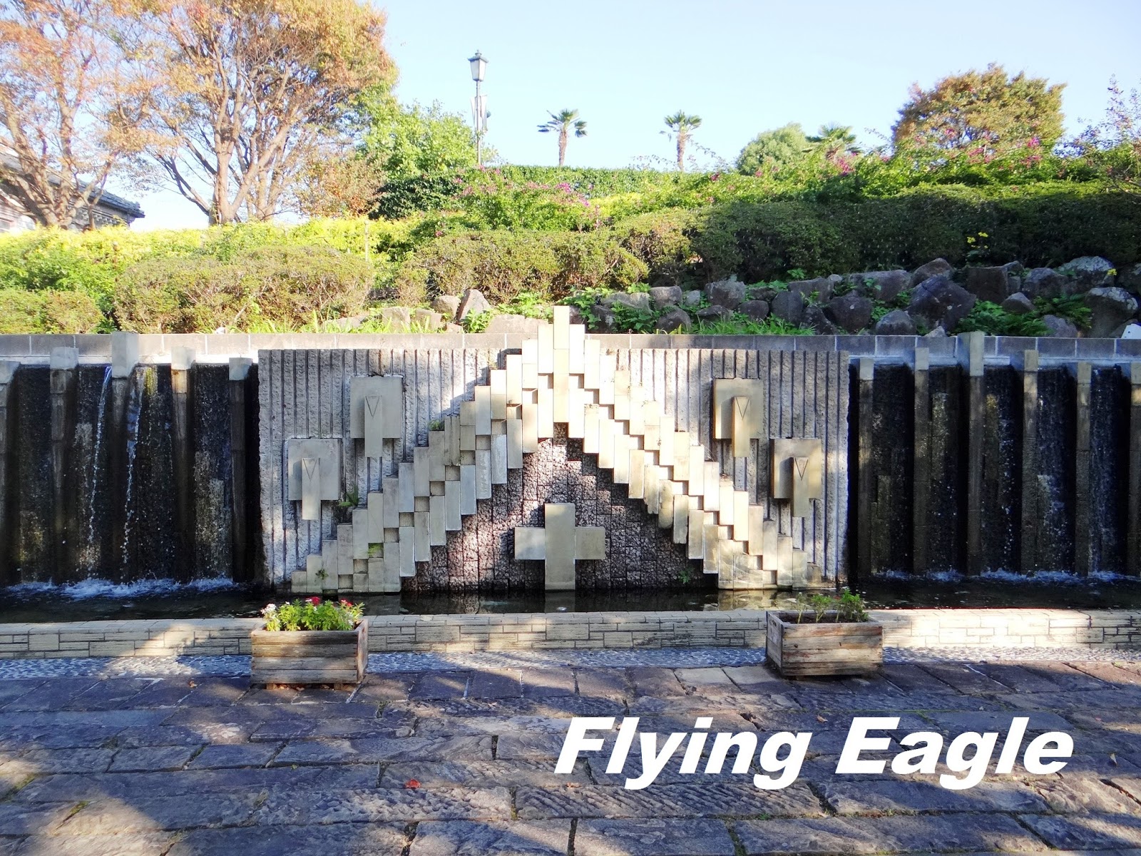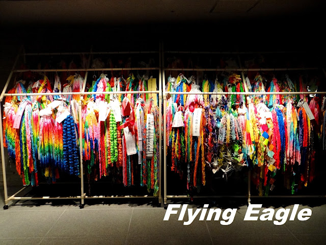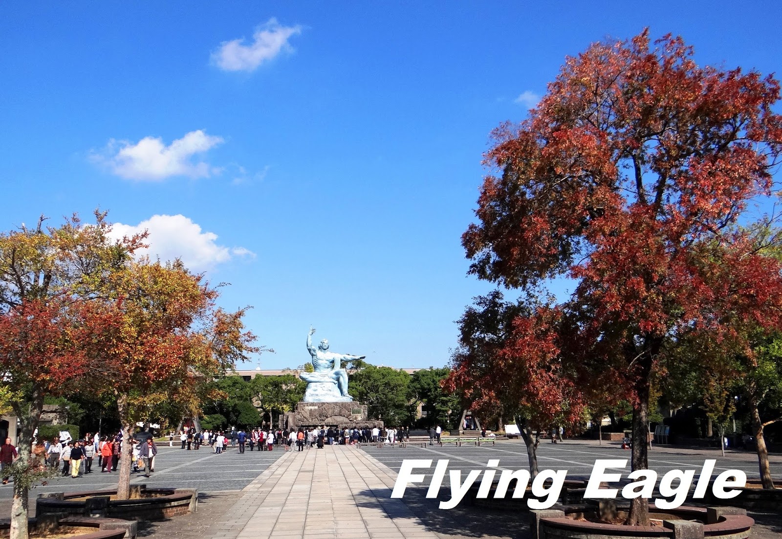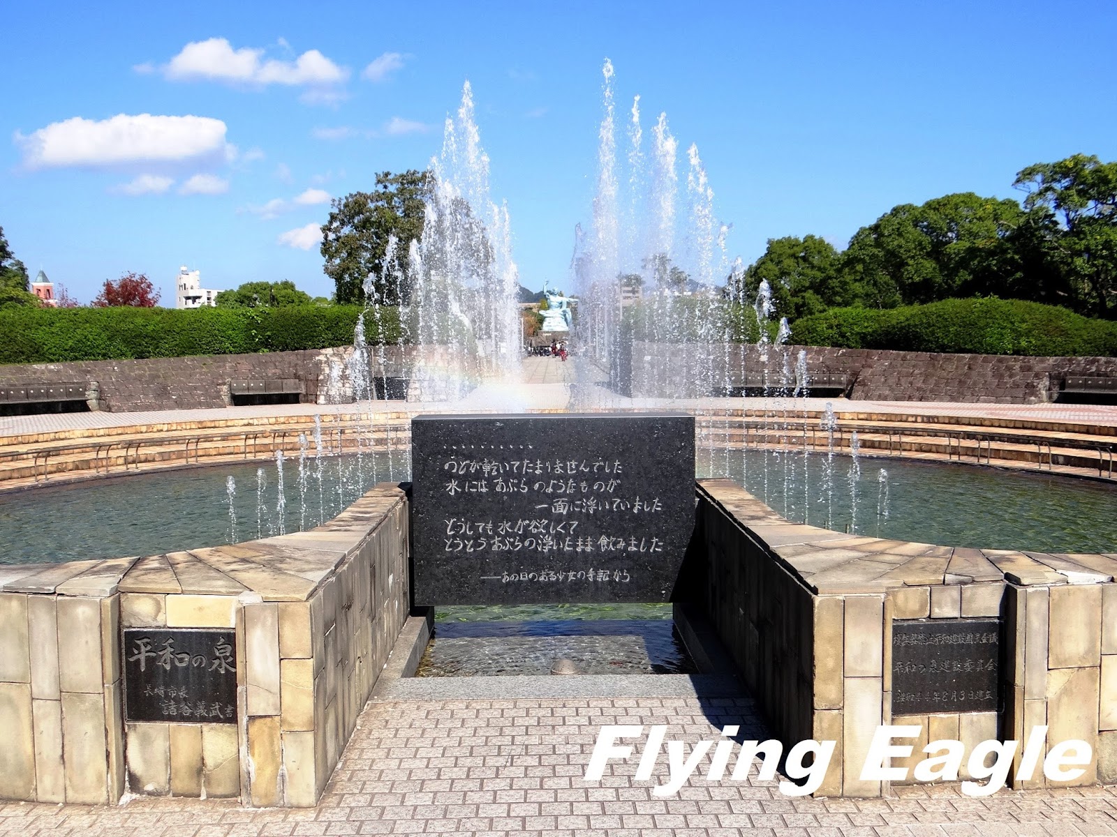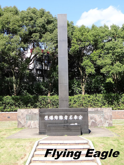 原子彈爆炸點附近,如今是和平公園。一進公園便是和平之泉,往前走便看見碩大無比的和平祈念像。雕像的兩側各有一座千紙鶴之塔,裡面滿滿的紙鶴代表人們對和平的期盼。我們碰到不同學校的學生來此參加紀念活動,老師告訴我們學生們每年要來兩次。和平公園往下走是長崎原爆公園(或稱爆心地公園),在原子彈爆炸的正中心處立有紀念碑。這裡還有一座紅磚的斷壁殘垣,是附近的浦上天主堂在爆炸後僅存的部分。浦上天主堂在第二次世界大戰時是東亞最宏偉的教堂,戰後的破落模樣令人唏噓!長崎市將殘破的牆壁移來這裡,以提醒世人戰爭之可怕。