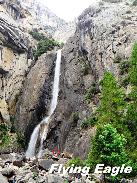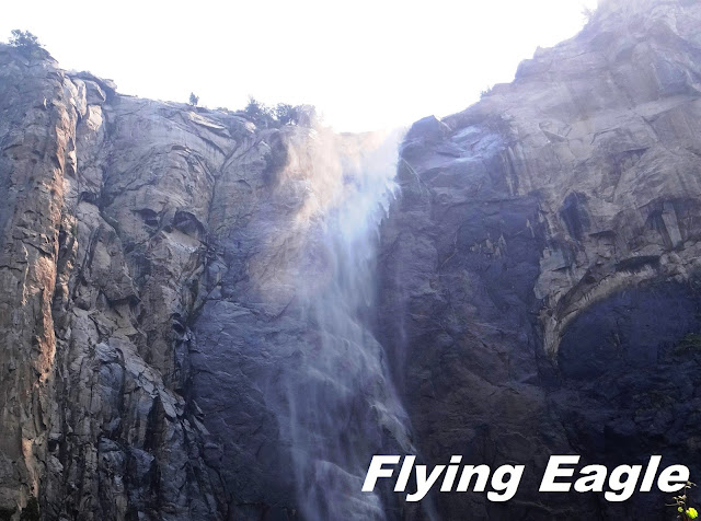 優勝美地山谷(Yosemite Valley)是園內最重要的一區,知名的岩石和瀑布均聚集在此。甫進山谷老遠就看到右邊山壁高處的瀑布被風掀起,彷彿有層薄紗在山頂飄舞,十分夢幻!這就是新娘頭紗瀑布。經過一段平坦易走的路,總算來到瀑布。瀑布周遭擠滿了人,不少人跑到瀑布底下要近距離接觸。新娘頭紗瀑布名字取得真好,一瀉而下的水流彷彿新娘腦後拖著的長長白紗。路邊有位中年男士半坐半躺,腳踝往一側90度彎曲,血透過球鞋滲出來,令人觸目驚心!男子表情平靜,旁邊有些救護人員等待直昇機來救援。據說公園裡每年發生不少意外,不可不慎!