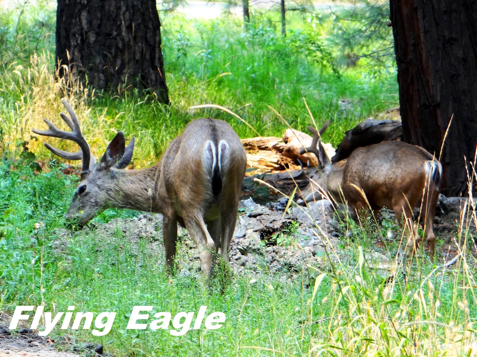 回到之前的路繼續前行,左邊的山壁上有兩個瀑布一高一低,合稱優勝美地瀑布(Yosemite Falls)。我們走步道就近觀看,才發現其實瀑布的水量頗為豐沛。尤其是位置低的那段,走得近還被水花濺到呢!半圓頂位於山谷的東側,因形狀奇特而聞名。它一面是半圓形,另一面則十分平坦,就像圓頂被利斧劈開一樣。從山谷觀看半圓頂,不太能體會它一邊直一邊彎的特色,但我們多年前的舊照從冰河點(Glacier Point)高處拍攝,就看得非常清楚了。我們看到幾隻鹿徜徉在大停車場附近,可見牠們已習慣與遊客共享空間。