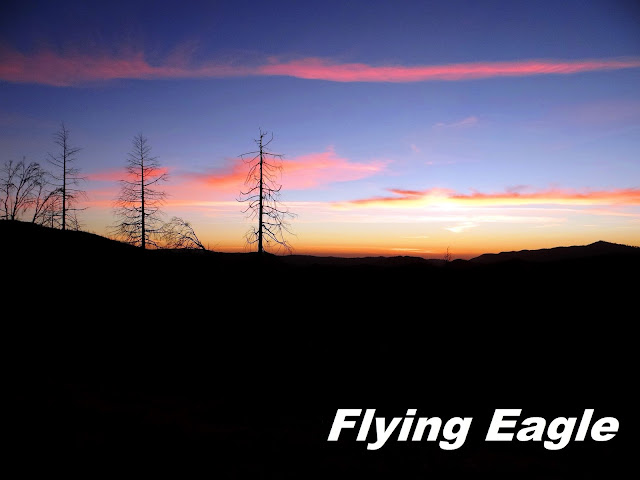 我們當晚並非住在公園內,所以必須趕路。回程沿路的日落景色讓人迷醉,藍天白雲仍在眼前,但天際增添了粉色的紅暈。樹木挺立在這畫面中,彷彿和我們一起等候落日。不一會兒夕陽便西沈,大地一片漆黑,但天空仍有微光,我們便在這微光中繼續前行。