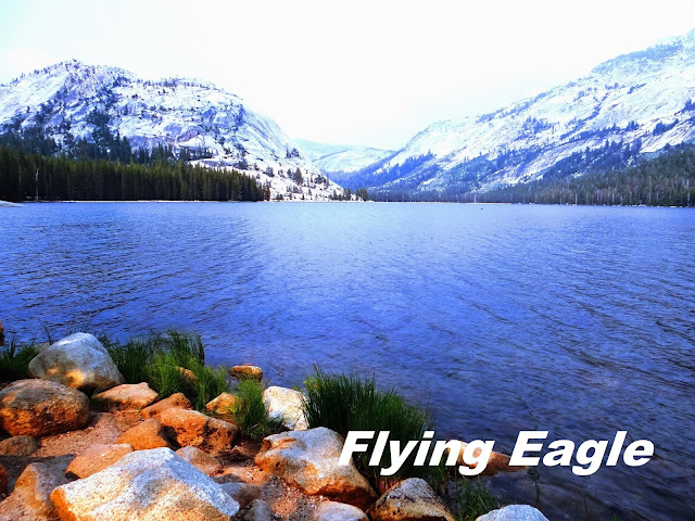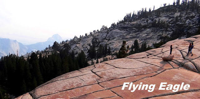 這一天我們沿著提歐加路(Tioga Road)走。優勝美地的景觀多樣,這一區的風景主要是高山、草地和湖泊。也因為這條路行經高山地區,每年約十一月至翌年五月會禁止通行。車子來到歐姆斯德點(Olmsted Point),在此可以遠眺半圓頂,不過因角度關係,形狀和之前看到的有所不同。這裡的花崗岩很有特色,岩石表面有著深深的裂痕,一格一格的,有些像棋盤。岩石有的部分光滑,有的部分則有樹木從石縫中鑽出,筆直屹立,生命力驚人!繼續沿大路前行不久,便是蒂娜亞湖(Tenaya Lake)。湖面高達8,150 呎(2,484 公尺),是由蒂娜亞冰河所造成的湖泊,同一條冰河還在優勝美地山谷切割出半圓頂。