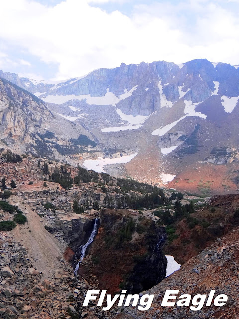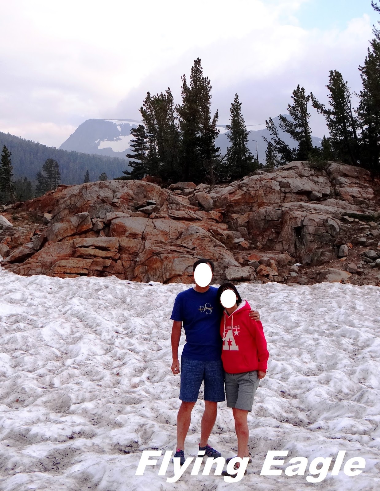 漸行漸東,來到了托勒尼草地(Tuolumne Meadows)。很難想像在海拔八千多呎的高處,竟有大片綠地。春末夏初會有許多野花在此綻放,其中包括魯冰花。草地周邊亦有大大小小圓頂狀的岩石,吸引不少攀岩人到訪。提歐加路上美景不斷,但並非所有美景都在優勝美地的範圍內。出了國家公園東邊的入口,就來到提歐加湖(Tioga Lake)。這裡十分僻靜,和人車擁擠的優勝美地山谷有天壤之別。在9,639英呎(2,938公尺)高的湖泊旁,風兒呼嘯而過,但卻有兩人從車上搬下椅子和書,面對湖光山色讀起書來,好不悠哉!剛過了湖,路旁一大片白雪皚皚,我們立刻下車捕捉這難得的畫面,享受一下酷暑中的冬天。有時在夏天會看到高山積雪長年不化,但這麼容易可以直接踩進雪堆,還是頭一遭。