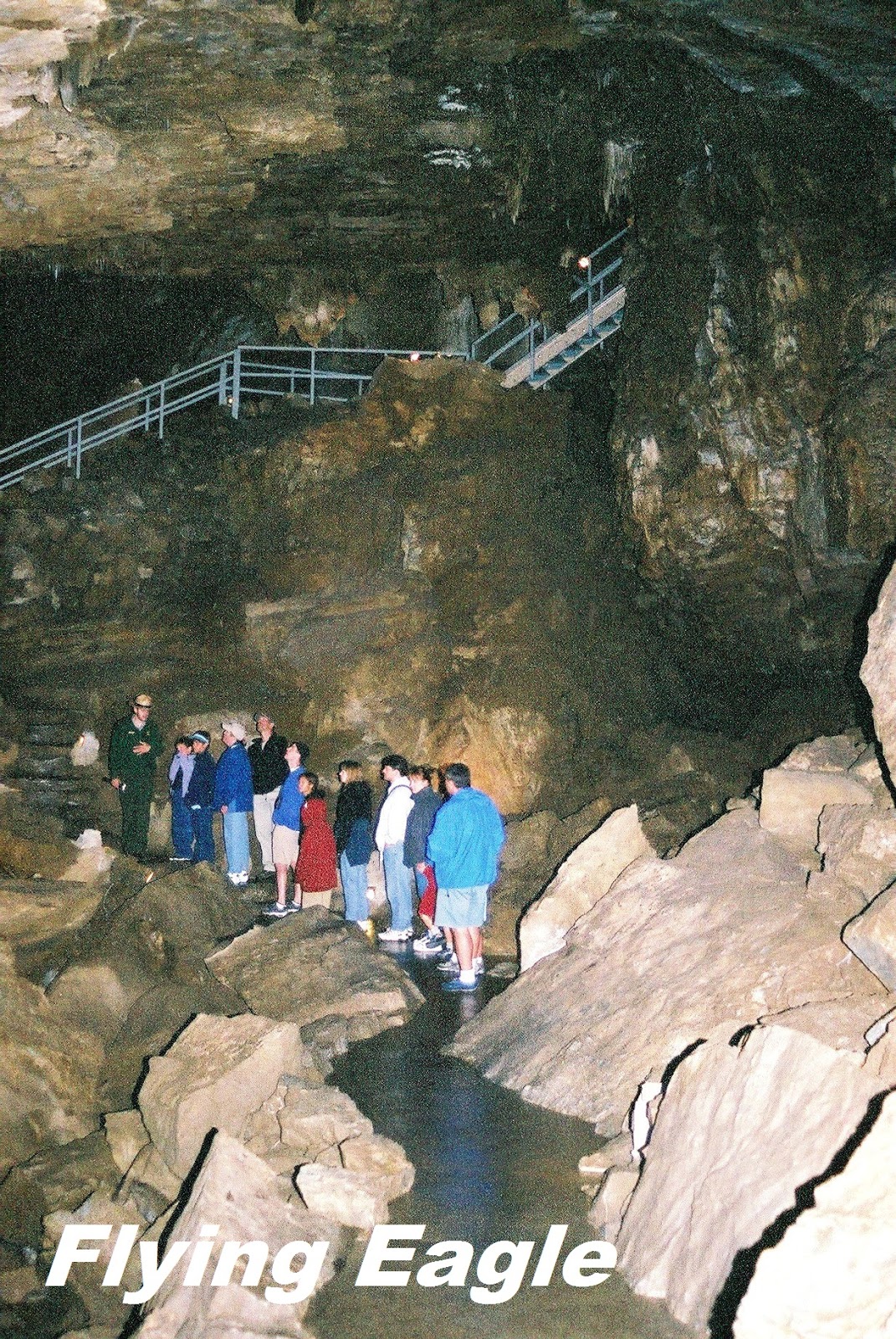 熔岩河洞窟同樣位在北區,我們2002年時去了,2017年未再訪。洞窟可自行參觀,不需管理員帶領。進洞後走長長的階梯往下,不多時便進入黑暗的世界,唯有仰賴租借的煤氣燈。洞裡有的部分很低,必須手腳並用、半走半爬才行。這個熔岩通道長5,211 呎(1,588 公尺),為奧勒岡州之最。暗無天日的洞內,溫度僅有華氏40度(約攝氏4度),和洞外溫差可達華氏50度,所以外套是來訪的必備物品。