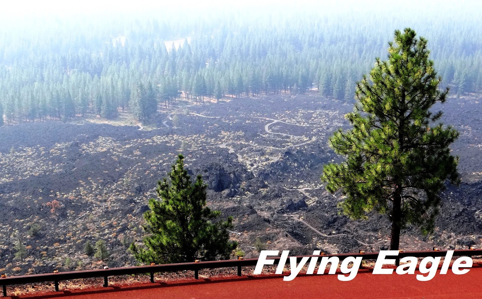 翌日早上我們前往北區的熔岩峰觀景點。2002年初訪時可以開車上峰頂,2017年再訪時有新規定,必須搭乘園區巴士來回,收費兩元。熔岩峰高度為5,020呎(1,530公尺),居高臨下看到火山爆發形成的黑色土壤,以及上面茂密的樹林。對照兩次到訪的相片,初訪時風和日麗,遠山都十分清晰,再訪時不巧附近有森林火災,天空和景色都變得迷濛。