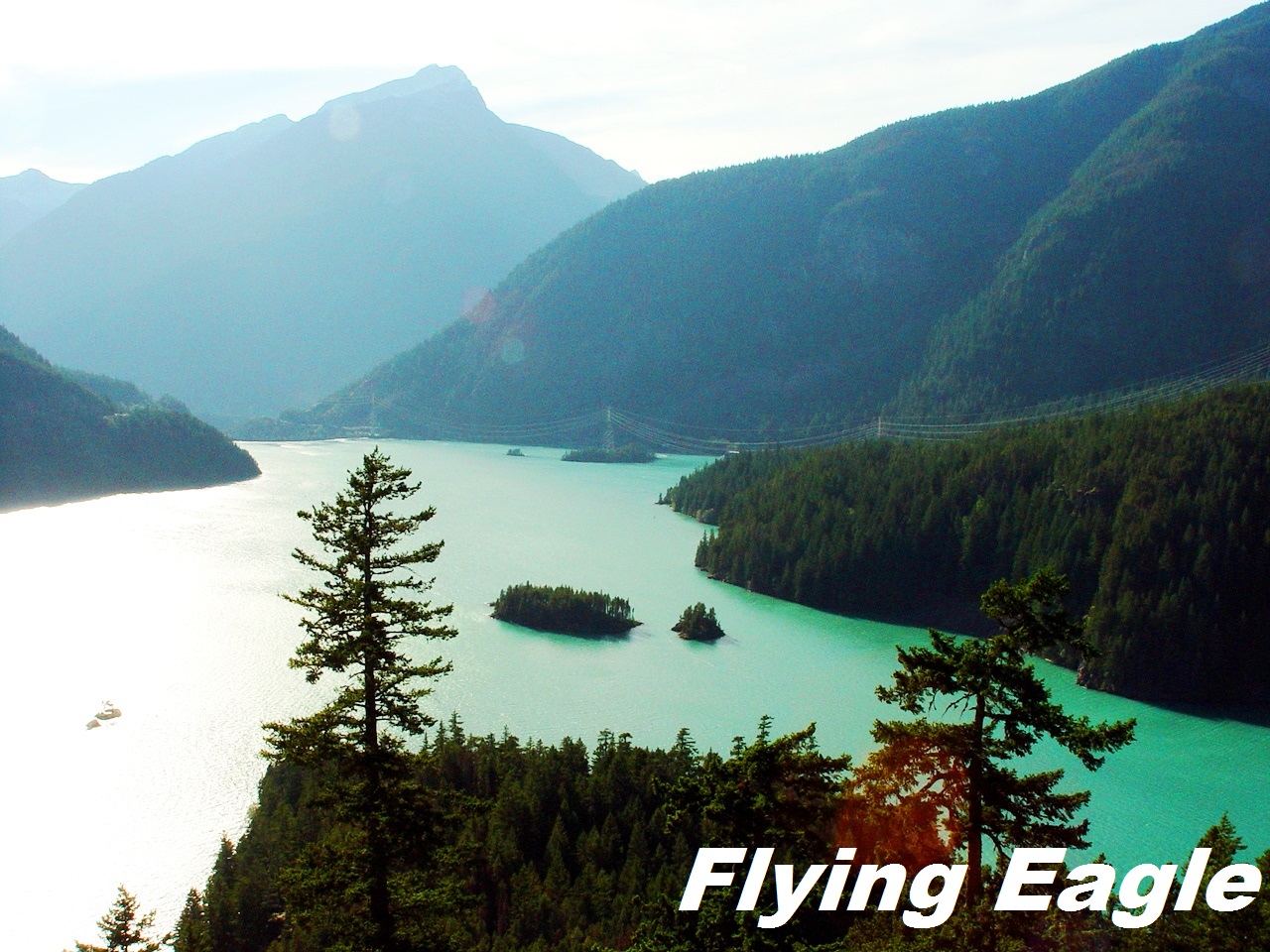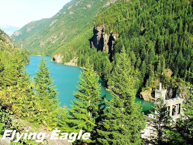要前往公園必須走20號公路,此路又名North Cascades Highway,橫貫公園中部。沿途會碰到幾個水壩和蓄水湖。我們先行經峽谷水壩(Gorge Dam),它的蓄水湖湖水碧綠,十分吸睛。再來是惡魔湖(Diablo Lake) 蓄水池,Diablo是西班牙文,意即惡魔。此處山光水色令人驚艷,幾乎誤以為美景乃麗質天生。