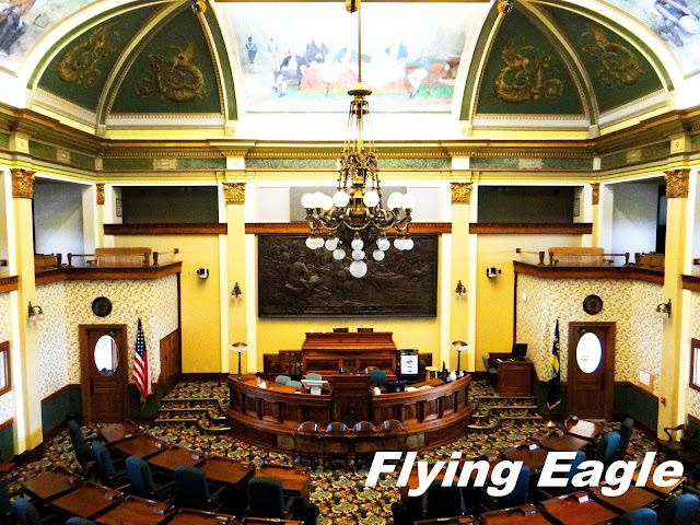 我們到訪時州府裡不單遊客極少,連工作人員都不見蹤跡,偌大的建築彷彿只有我們。眾議會和參議會均開放讓人拍照,共同特點是僅以吊燈和歷史畫裝飾。參觀完州府後,在府前草地看見幾隻鳥兒,漆黑的身軀前後各貼了撮白毛,長長的尾毛筆直,好像黏了塑膠吸管。牠們旁若無人地在草坪上踱步,是當日的驚喜。