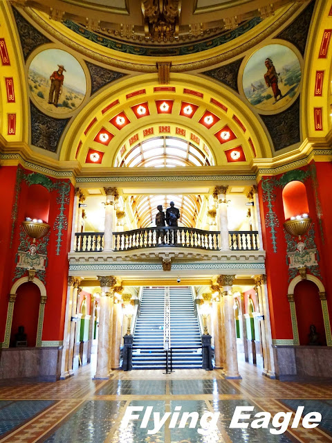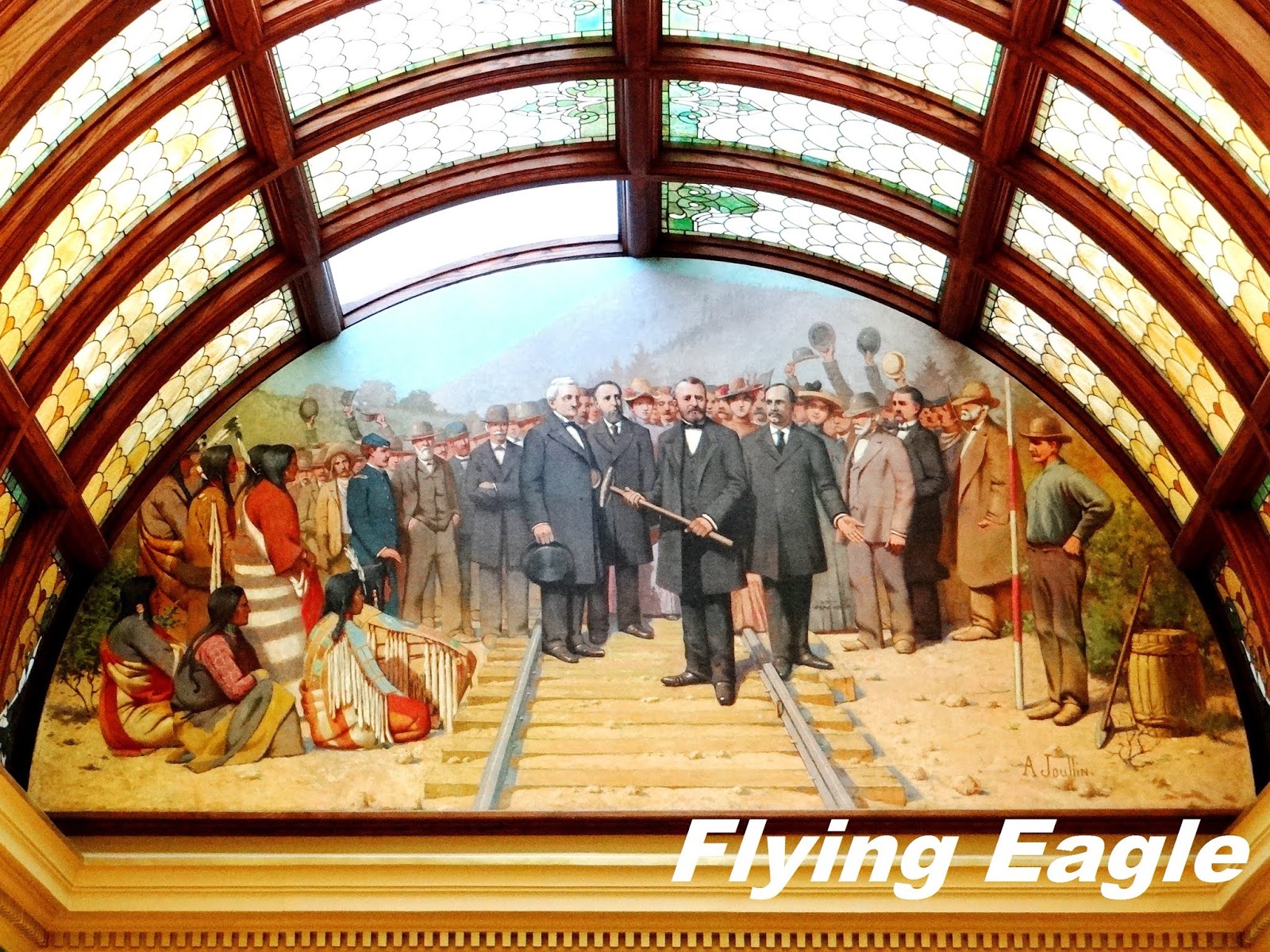 州府大廳以金和紅兩種色調為主,也許時值休會期間,僅有少數燈光照明。圓頂的色澤就暗沈許多,予人安靜低調的感受。圓頂的周邊掛著四幅圓形畫作,畫中是該州早期的四種居民——印第安原住民、探險者、淘金者、和牛仔。另外還有一些油畫描繪早期居民的生活,提醒後代毋忘自己的歷史,也是州府的一大特色。我們在其中一幅畫中看到中餐館,可見當時已有相當數量的華人遠渡重洋來此。