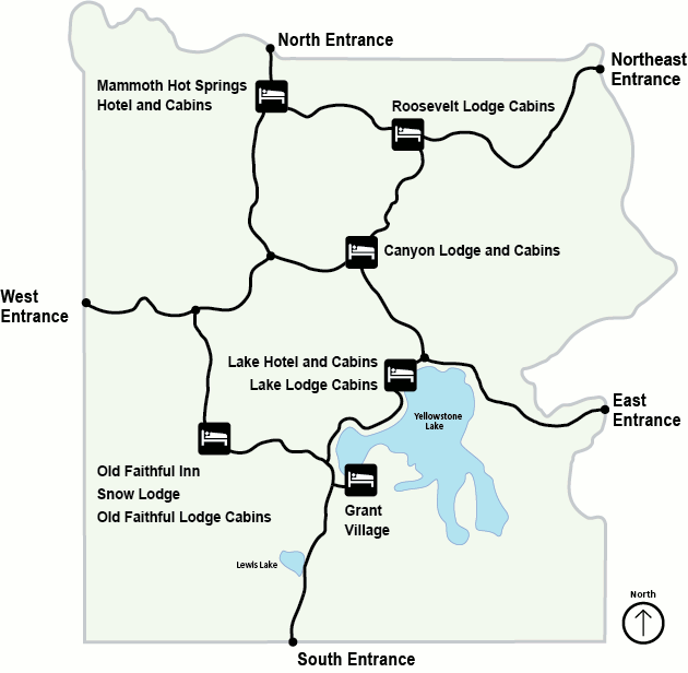 黃石公園內有九間旅館,特色是難訂和昂貴。訂房的主要考慮是地點,我們此行住了峽谷區的峽谷小屋(Canyon Lodge)四晚,另加老忠實區的老忠實旅館(Old Faithful Inn)一晚。之前到訪時則住過格蘭特村(Grant Village)、湖邊小木屋(Lake Lodge Cabins)和湖畔飯店 (Lake Hotel)。如果能訂得到的話,老忠實旅館是首選,因為它附近的景點最多,其中有些步行可達,不必賞景完摸黑開車回住處。黃石從一區到另一區在地圖上看來只有短短的路程,但往往單程都要一小時。如果考量預算,園內還有五個露營場地,不過同樣要提早預訂。
