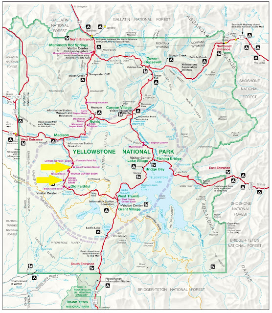巨泉噴泉(Great Fountain Geyser)位於下噴泉盆地(Lower Geyser Basin),和上述幾個著名噴泉所在的上噴泉盆地(Upper Geyser Basin)相距較遠。它不噴則已,一噴就讓人刮目相看,通常會持續噴發一小時,甚至曾有連續兩小時噴發的紀錄。如果說其他噴泉是水柱,巨泉便是水簾幕,從線條變成面。我們此次未碰上它噴發,但從舊照仍可感受它磅礡的氣勢。