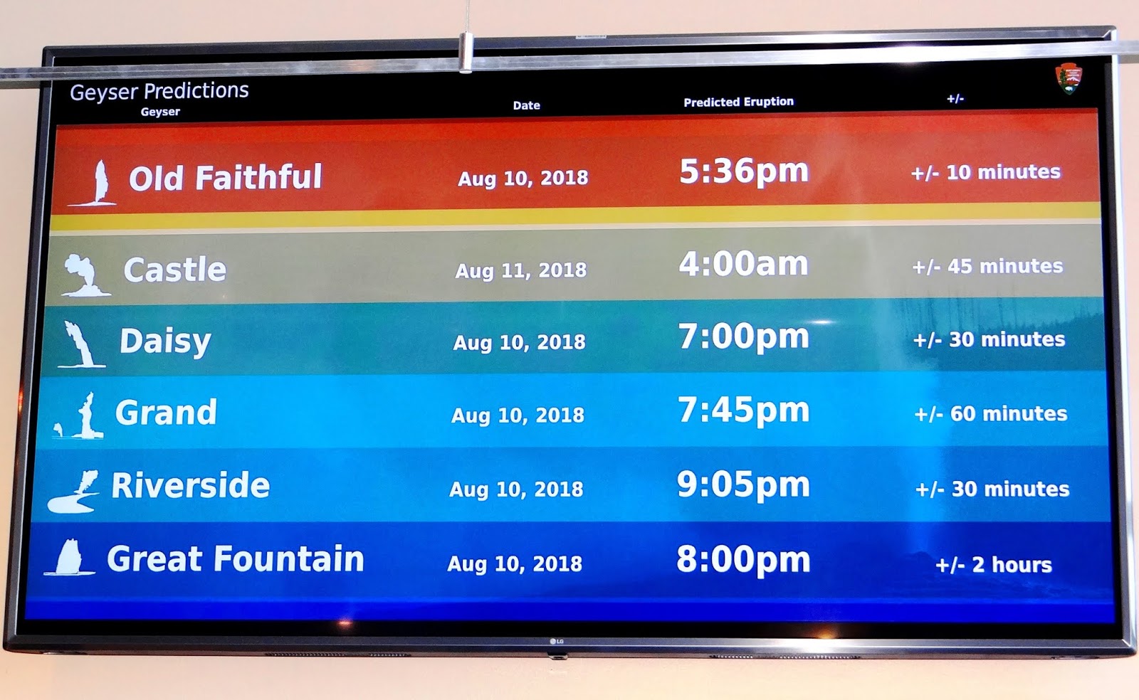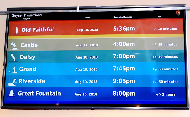 想觀賞這些噴泉並非純碰運氣,噴發時間較為規律的幾個著名噴泉,遊客中心都列出下次噴發的時間。因為是預估的時間,誤差範圍可達四個小時。從預測的時間表看來,老忠實噴泉(Old Faithful Geyser)只消等候 20分鐘便一定可以看到,如此規律讓其他噴泉望塵莫及,也為它贏得老忠實的名號。預測時間表旁邊還繪出每個噴泉的形狀,簡單幾筆便勾勒出噴泉的特色。