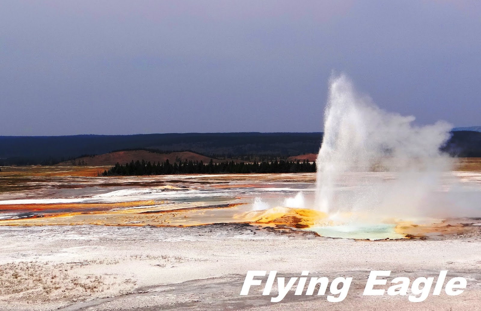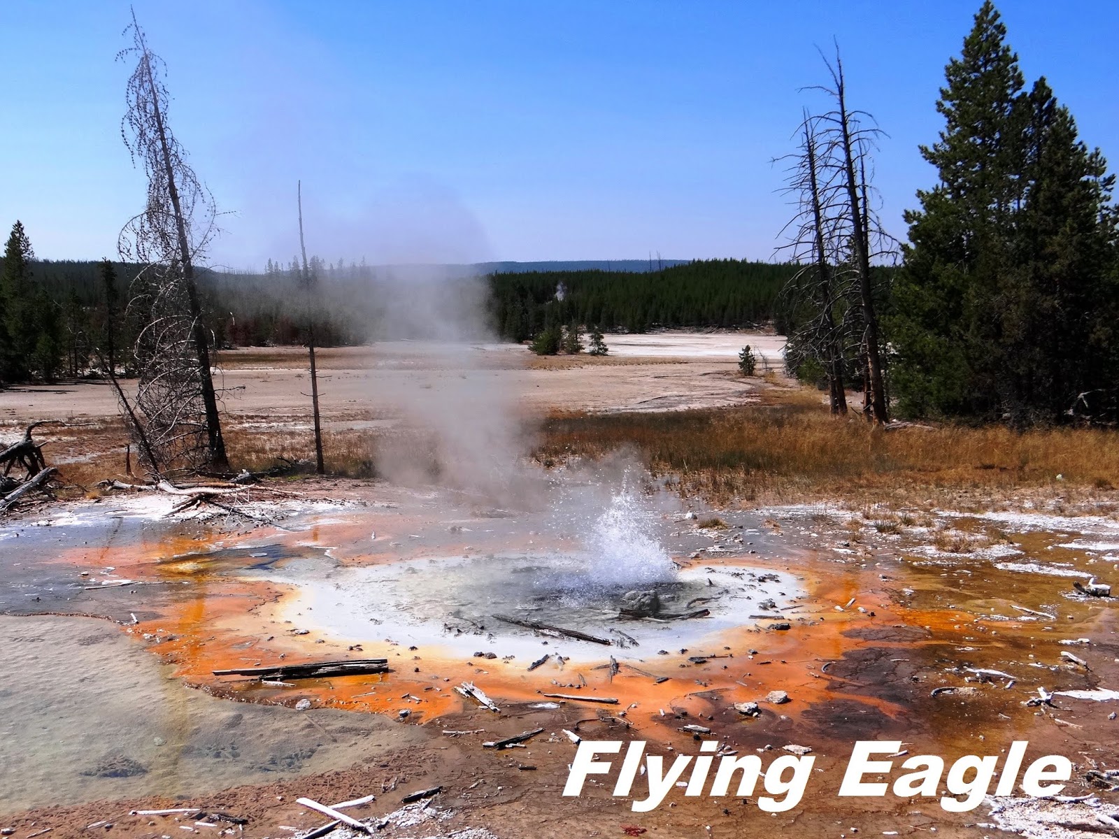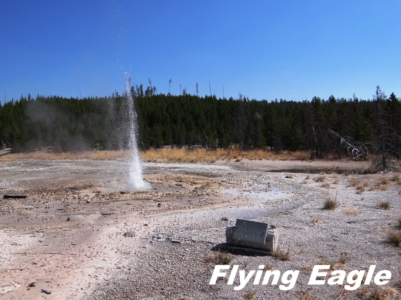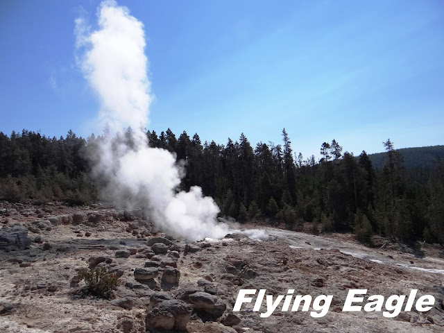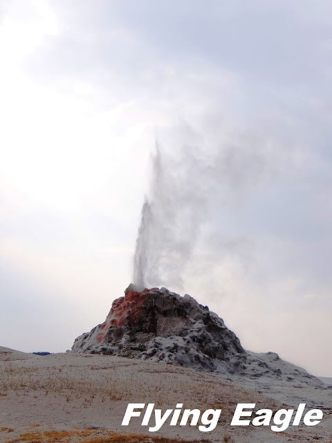 下噴泉盆地(Lower Geyser Basin)的火洞湖路(Firehole Lake Drive),除了以前寫過的巨泉噴泉(Great Fountain Geyser),還有不少景觀值得一看。火洞池(Firehole Pool)在這條單向道的起點附近,今昔相比,似乎以前附近的樹木較茂密,池中央的溫度也較高。白圓頂噴泉每次都盡情演出來歡迎我們。這次我們行經它身邊,它毫無預示就噴了起來,溫熱的水灑在身上,有種天降甘霖的感覺。火洞湖是個溫泉,周圍有幾個玲瓏可愛的小噴泉,有時它們會同時噴發,就像小朋友一起唱歌跳舞,彼此助興。這一區遊客不多,可以好整以暇靜觀噴泉的變化,不受干擾。