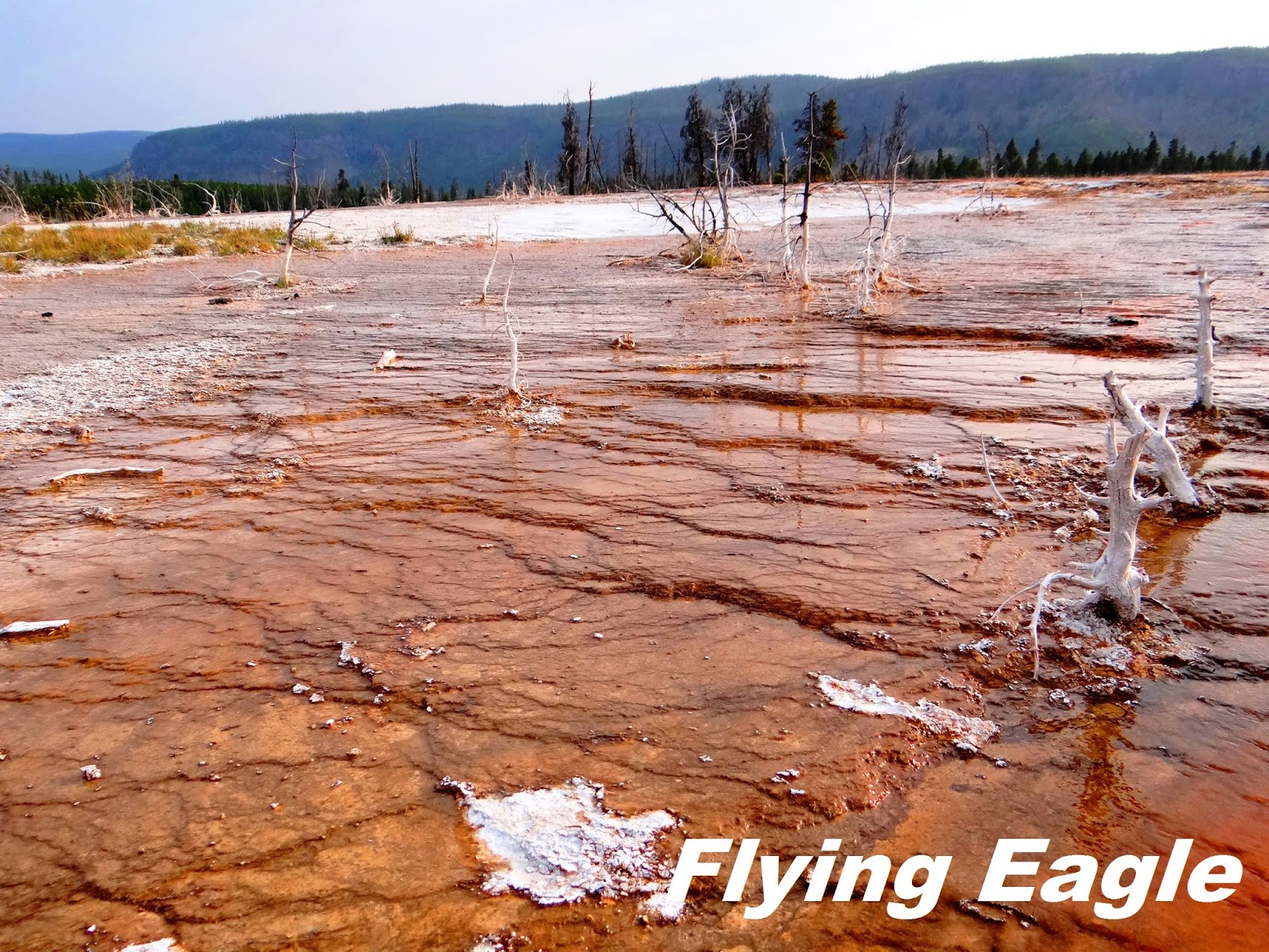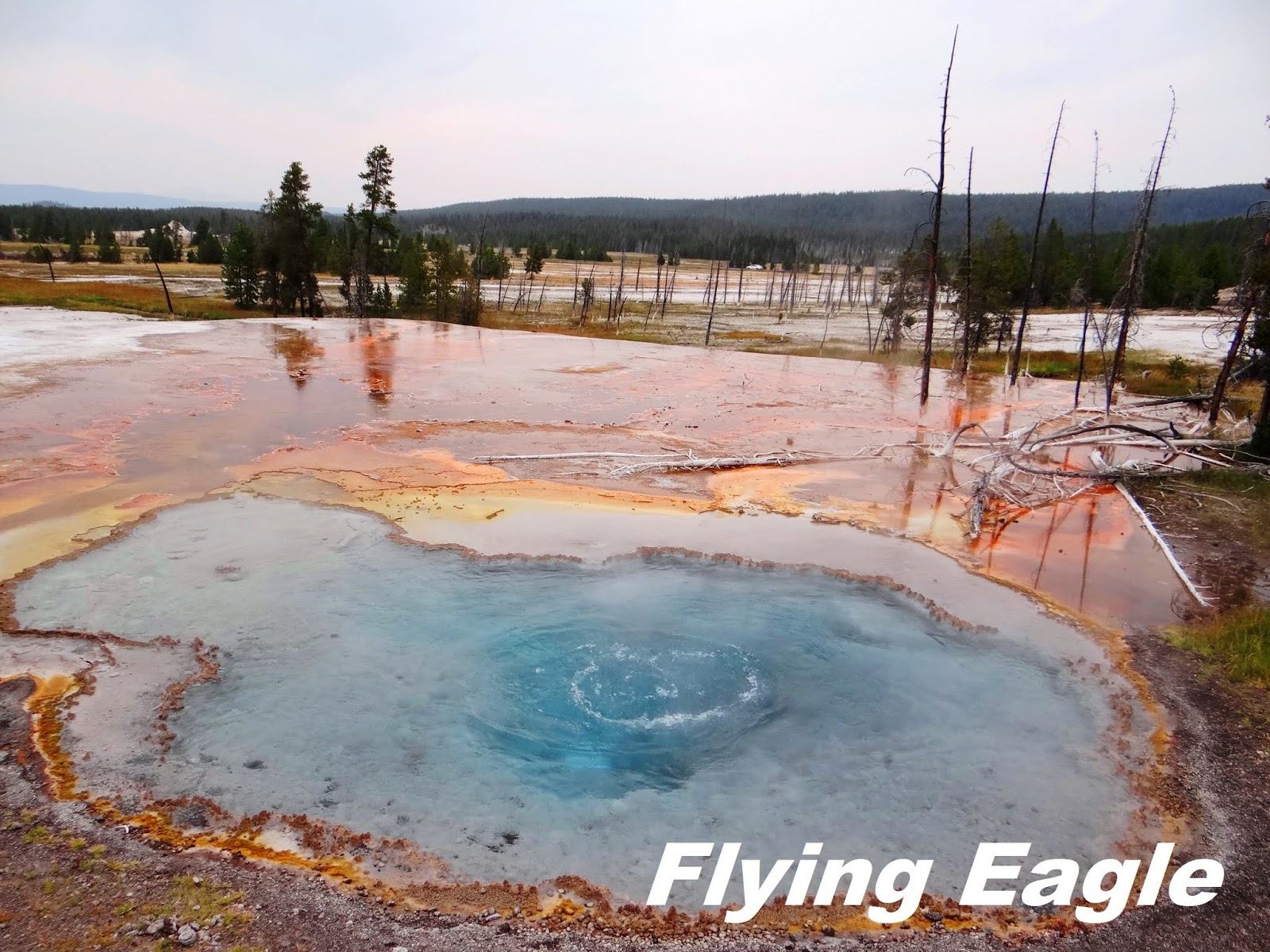 稍微往西就是黑沙盆地(Black Sand Basin),懸崖噴泉就在此處。噴泉位於溪流旁,噴發的沈積物堆積在周圍,好像懸崖的崖壁,因而得名。如果天氣好,依山傍水的懸崖噴泉看來挺美的。往北走是餅乾盆地(Biscuit Basin),這裡的溫泉池的藍似乎用牛奶調和過,帶有些許乳白色澤。盆地溫熱的泉水流淌過黃褐色的大地,枯乾的樹幹彷彿和泉水作殊死戰,不願放棄腳下的寸土,有點悽愴的美。