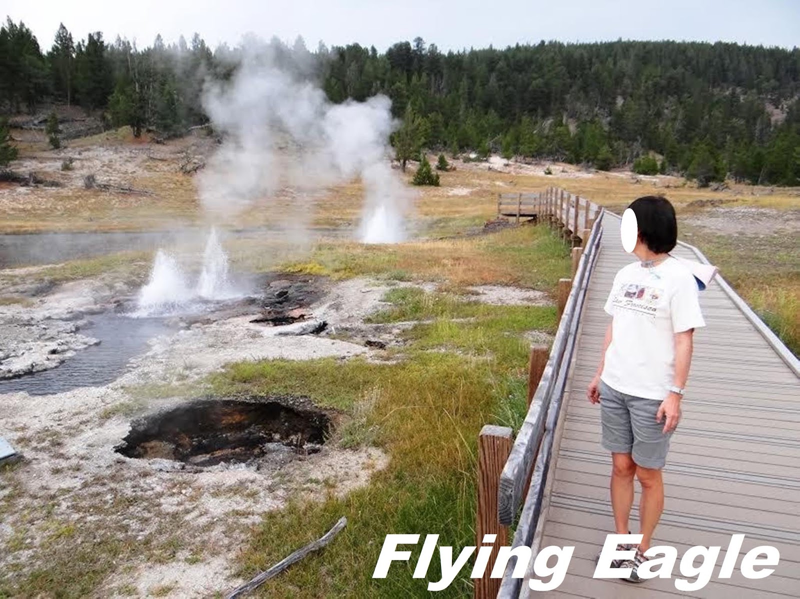 遊客必到的上噴泉盆地(Upper Geyser Basin),除了之前寫過的著名噴泉之外,還有幾座以公獅、母獅、大獅、小獅為名的噴泉,合稱為獅子家族(Lion Group)。其中最大的公獅噴泉呈圓錐狀,噴發時發出的聲響有如獅子吼叫一般。對比舊照,公獅噴泉水柱和煙霧的方向和形狀,似乎沒有太大的改變,性格始終如一。