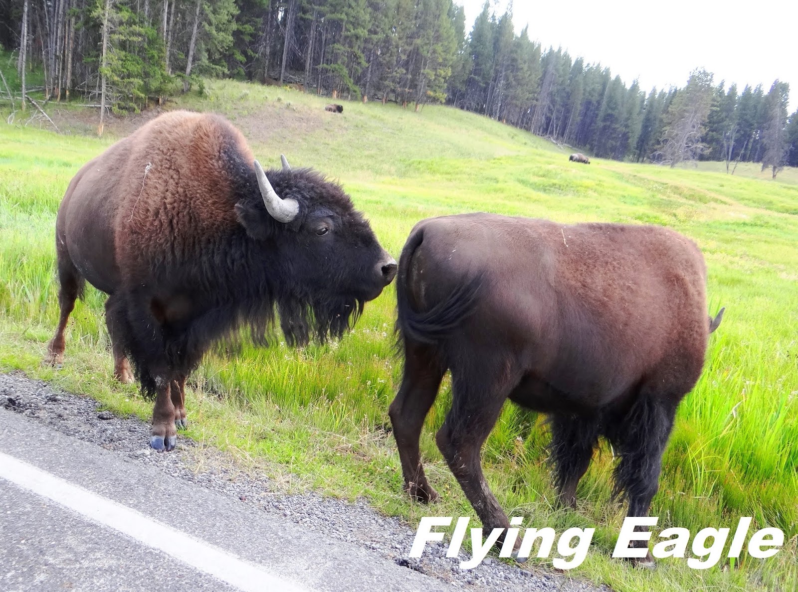 黃石公園的一大特色是野生動物,近60種野生動物棲息於此,之前寫過熊、叉角羚、大角羊和美洲野牛(bison),其中最常看到的當推美洲野牛了。牠們有時三三兩兩,坐擁一方草地;有時也浩浩蕩蕩,結伴同行。牠們很常悠遊在海頓山谷(Hayden Valley)一帶,海頓山谷介於峽谷區和黃石湖之間,大片的草原有黃石河靜靜地淌流其中。有水有草,無怪乎美洲野牛喜歡在此徜徉。美洲野牛龐大笨重,總是慢悠悠的,要是碰上牠們過馬路,可真是耐心的考驗。