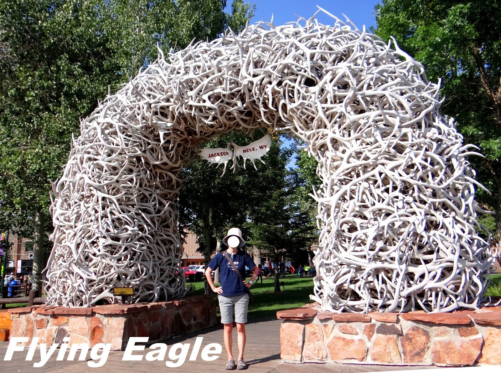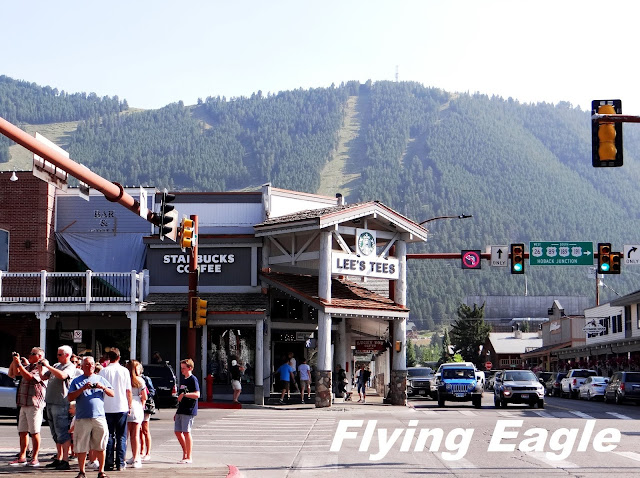 公園最南端外面有座小城叫傑克森(Jackson),曾有不少電影在此取景。整座城充滿了度假風味,餐廳和商店林立。最引人注目的是位在城市中心的廣場,廣場的四道拱門由鹿角堆疊而成,從60年代就屹立於此。仔細端詳,光是一道拱門就用了數不清的鹿角,甚為罕見。我們多年前在廣場旁拍了相片,對比今昔,山坡上的滑雪道依舊,路旁的店家已全非。廣場旁常上演牛仔短劇,吸引不少人圍觀。