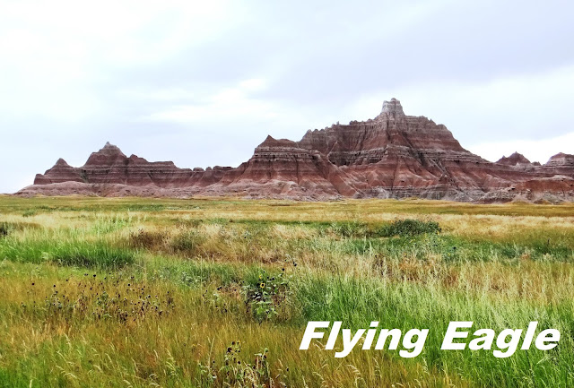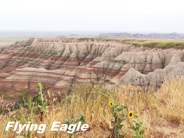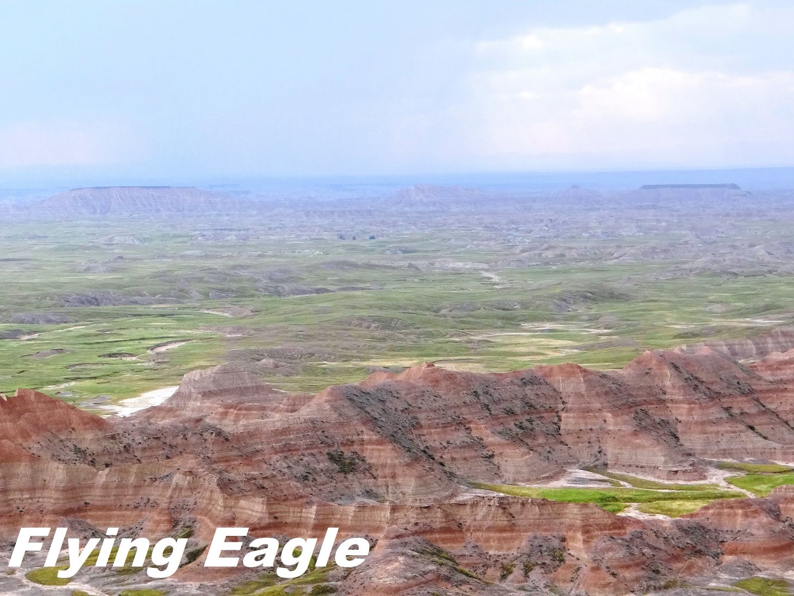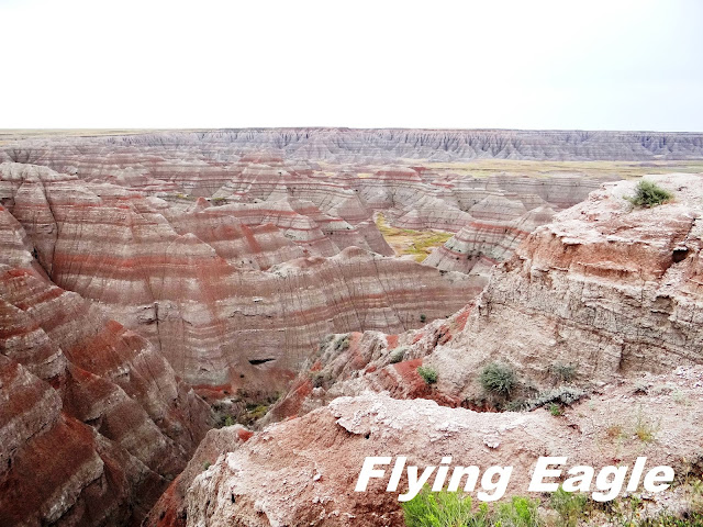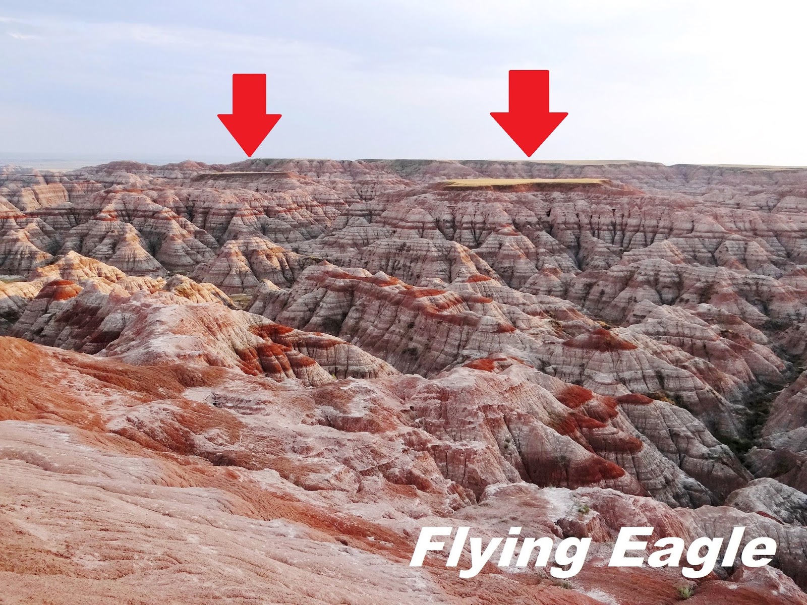 我們從南區入園,來到這區比較知名的景點羊山台地(Sheep Mountain Table)。沿著蜿蜒的碎石路到達山的最高處,這裡地勢平坦。放眼望去,看到綠色的草地交錯在惡地間。對比北區,南區仍然保有較多原本的草原樣貌,侵蝕成惡地地形的情形似乎不若北區嚴重。下山後沿著大路東行前往北區,途中穿越大片草原,這是全美數一數二的大草原。從長鏡頭看見有些黑色的動物低頭吃草,應該是美洲野牛。