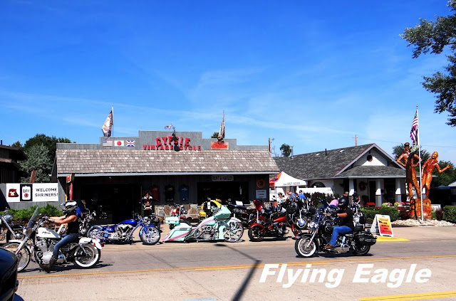 進城後,重型機車絡繹於途。遊客中心的牆上掛著之前活動的相片,與會人士把街道擠得水洩不通,盛況驚人。環顧四周,形形色色的重機讓人大開眼界,其中亦有顏色嬌柔粉嫩的,一改重機予人的粗獷印象。街上還有讓騎士沐浴的地方,同時亦可洗車,是我們沒想過的服務。重機大會師當然不只是摩托車威風凜凜地來去穿梭,還有重機展示秀、狂歡派對、賽車和音樂會等,主要的街道更是汽車止步,僅供行人和重機通行。
