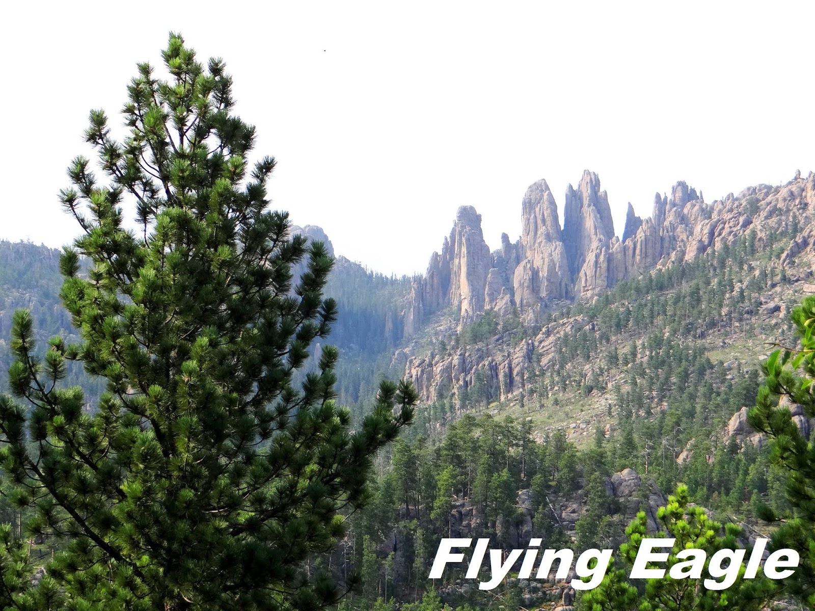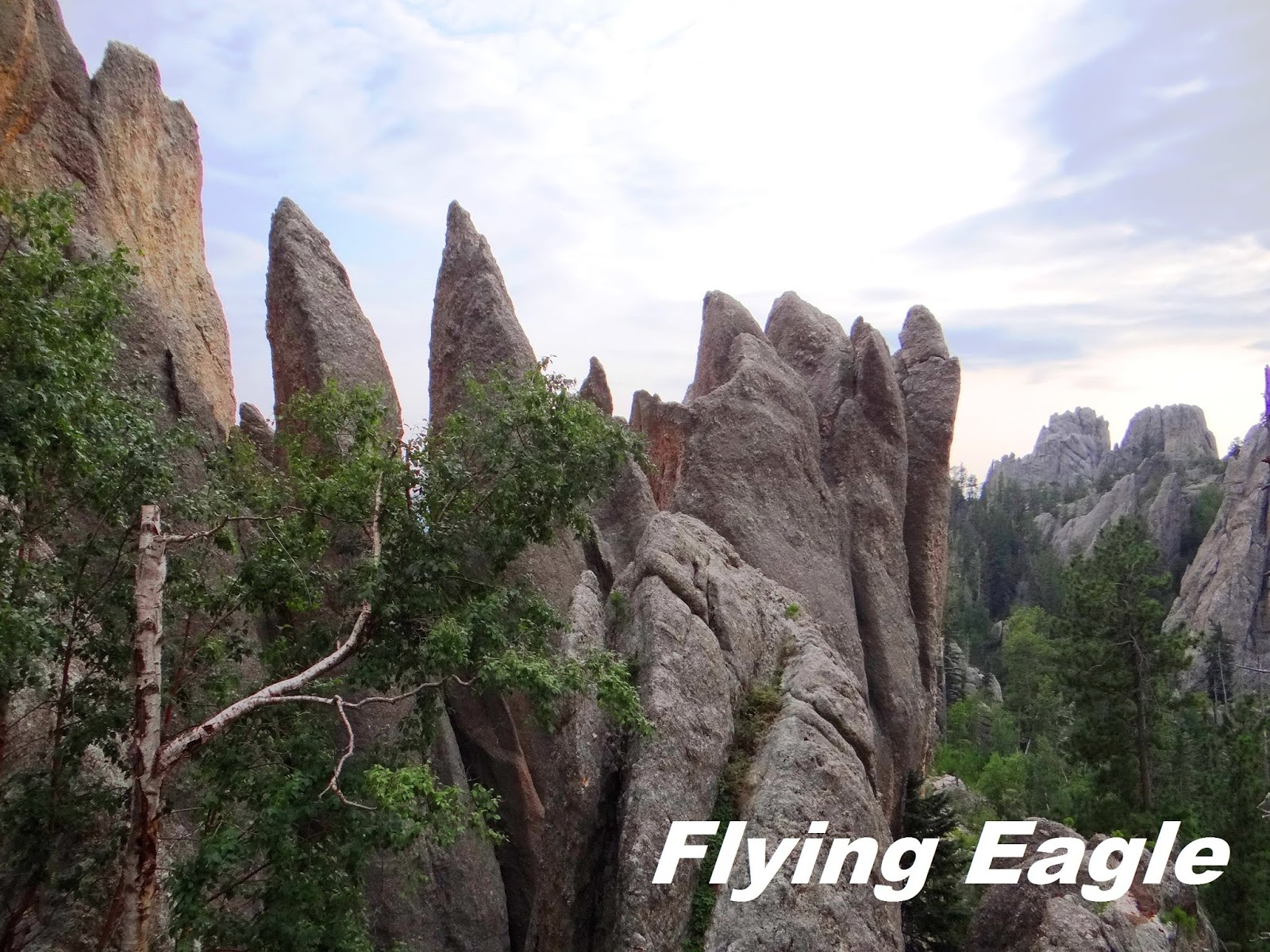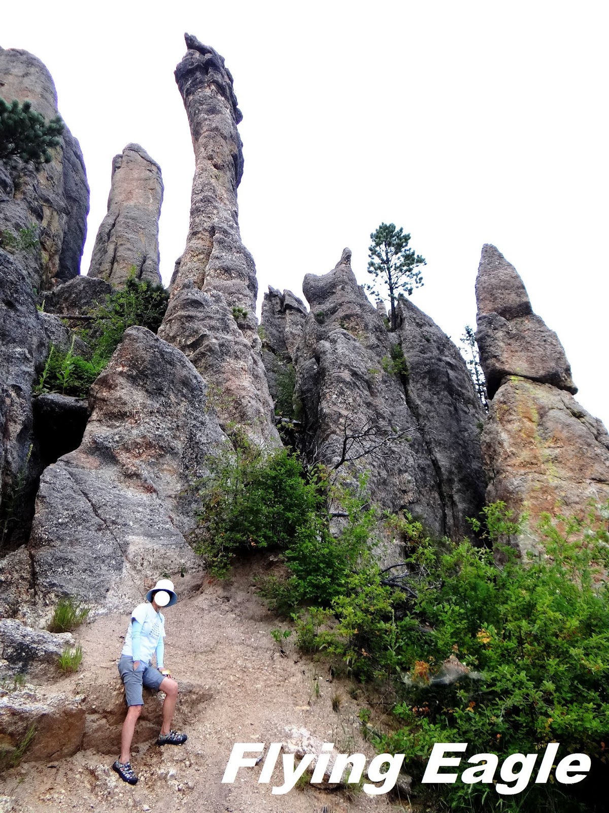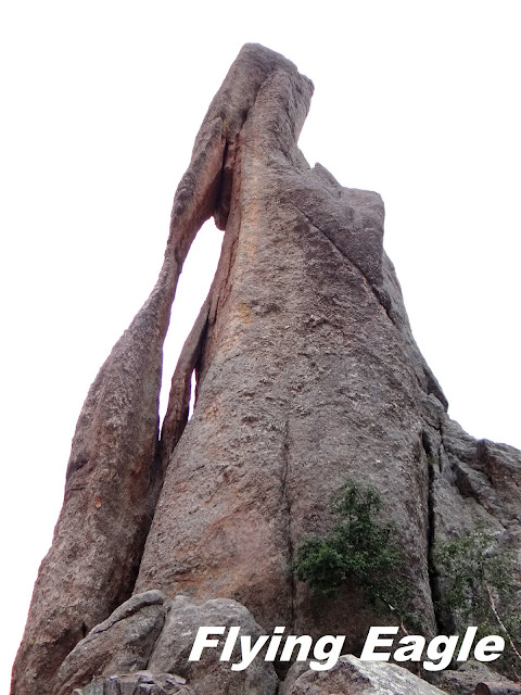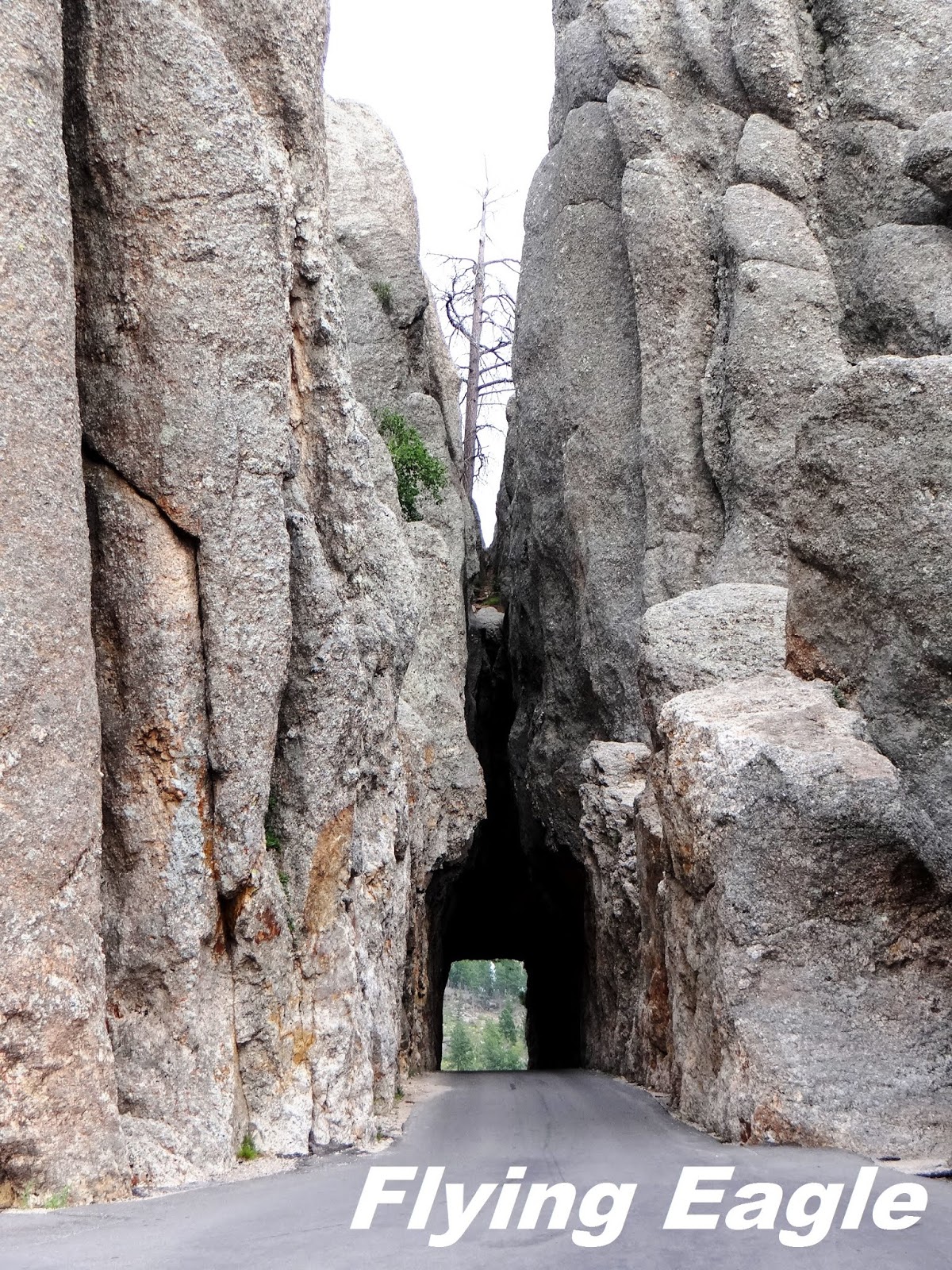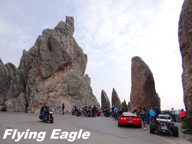 我們先前往著名的尖針公路,由於天候關係,這條路冬季不開放。老遠就看到一根根的花崗岩石柱聳立,大片石林指向天際。正因這些石柱遠望有如尖針,公路便以此為名。路上有個大拐彎風景不錯,有人在此做起生意,蹲在地上拍下重機騎士行經石柱的英姿。這門生意引起我們的注意,也選了個好位置留下了身影。再開了一段路便到了針眼隧道(Needles Eye Tunnel),隧道僅有8呎4 吋 (254公分)寬,車子大些都進不去。過了隧道之後,便是赫赫有名的針眼(Needles Eye)了。看著針眼,忍不住會心一笑,它可真是名副其實啊!的確,既有尖針,豈能沒有針眼呢?這裡有一片可停車的空地,讓人仔細觀賞大自然的鬼斧神工。