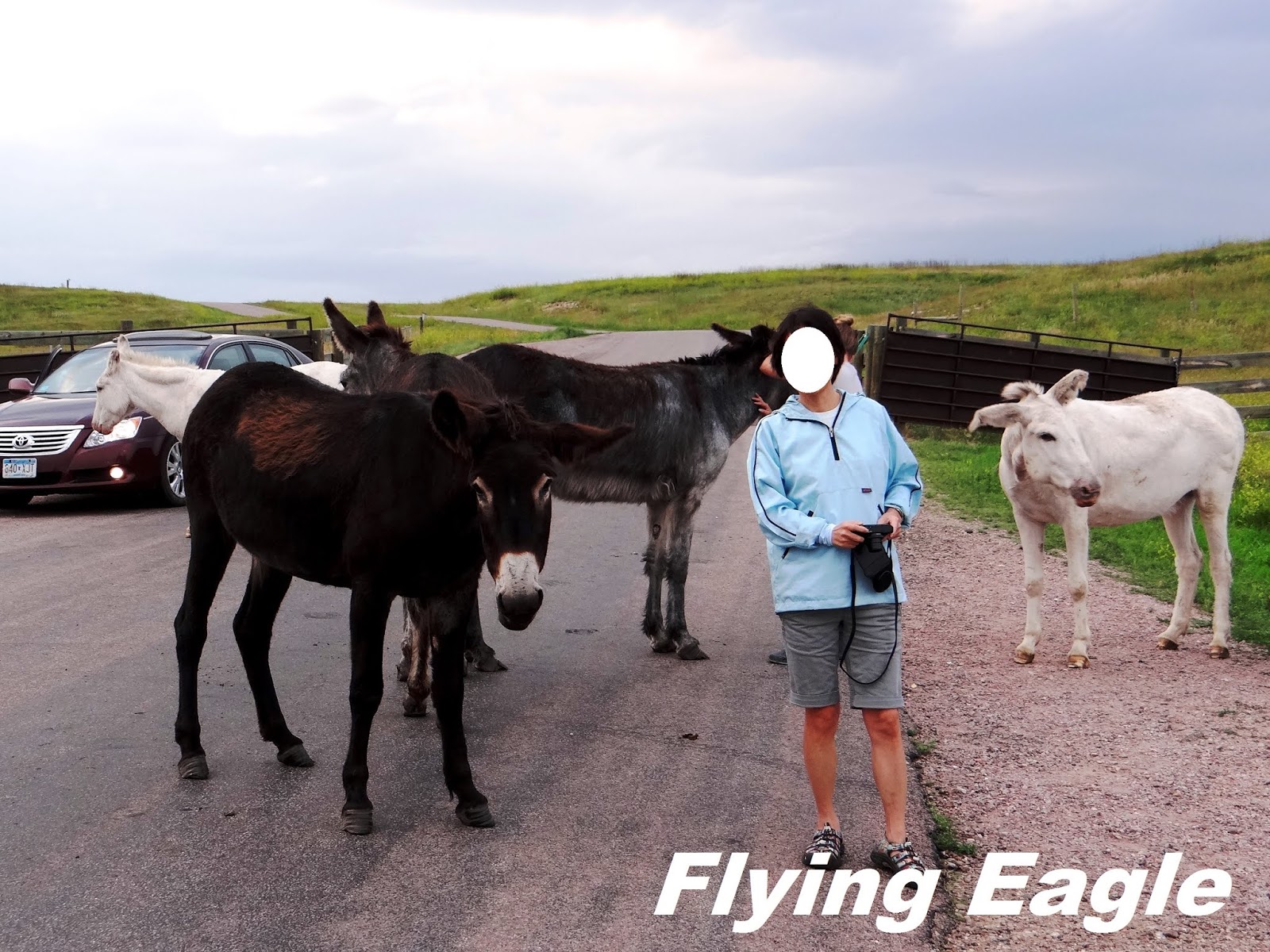 Custer State Park佔地逾七萬英畝,比台北市還要大,野生動物在此可自在悠遊。和野驢近距離接觸一開始會怕怕的,慢慢覺得牠們蠻友善,就較為放鬆。有些美國人會用手摸,臉也貼上去,野驢也很溫馴。