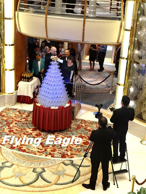 在遊輪上沒太多事做,便徹底從船頭到船尾走一遭,認識一下環境。鑽石公主號沿路會停靠幾個碼頭,讓遊客上岸參加各種短途旅行(excursion)。我們趁著遊輪仍在緩緩行駛往第一站的此時,詳細了解這些 短途旅行的內容,看看哪些值得參加。這些短途旅行並不便宜,遊客可以參加遊輪提供的,也可以下了船再報名當地旅行社辦的。經比較,後者往往是前者一半或更低的價格,不過品質如何就不得而知了。為了慶祝遊輪假期的開始,船上特別舉行倒香檳儀式,並由船長致歡迎詞。