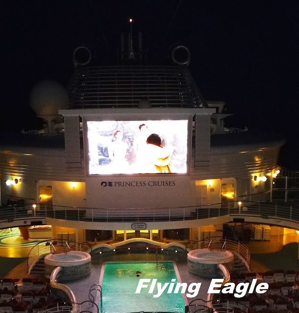 夜幕低垂後沒有茫茫大海的景致可觀賞,但郵輪上仍有各樣的活動。愛跳舞的就去酒吧婆娑起舞,有些人回到房間看電視播放的電影,另外還有露天劇院。