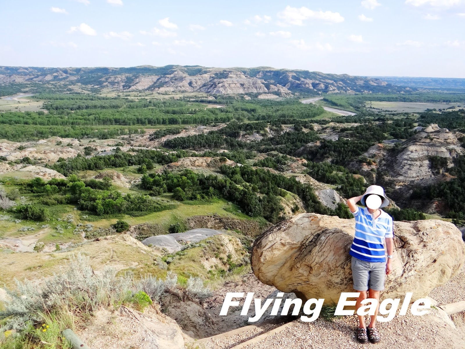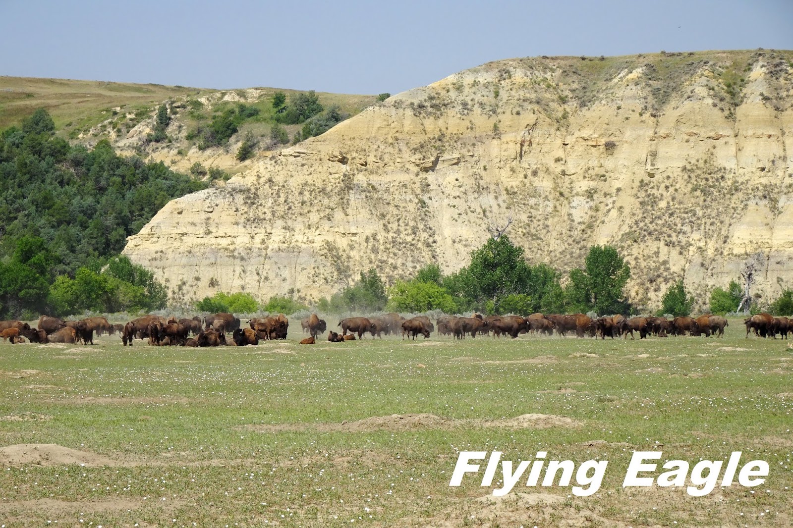 繼續前行,在波伊寇特眺望點(Boicourt Overlook)聚集了十來位遊客圍觀,原來遠望有大批美洲野牛成群結隊。我們往前再走一段路便到該批野牛所在之處,近距離觀察。牠們雖然安靜吃草,但粗壯的體型動輒揚起沙塵。而在壯碩的野牛群前,竟然有小小的土撥鼠在忙碌穿梭,大與小的對比形成有趣的畫面。天際遠景(Skyline Vista)有條長僅0.2哩(320公尺)的步道,簡單易走,可以俯瞰小密蘇里河和往來公園的要道94號公路。