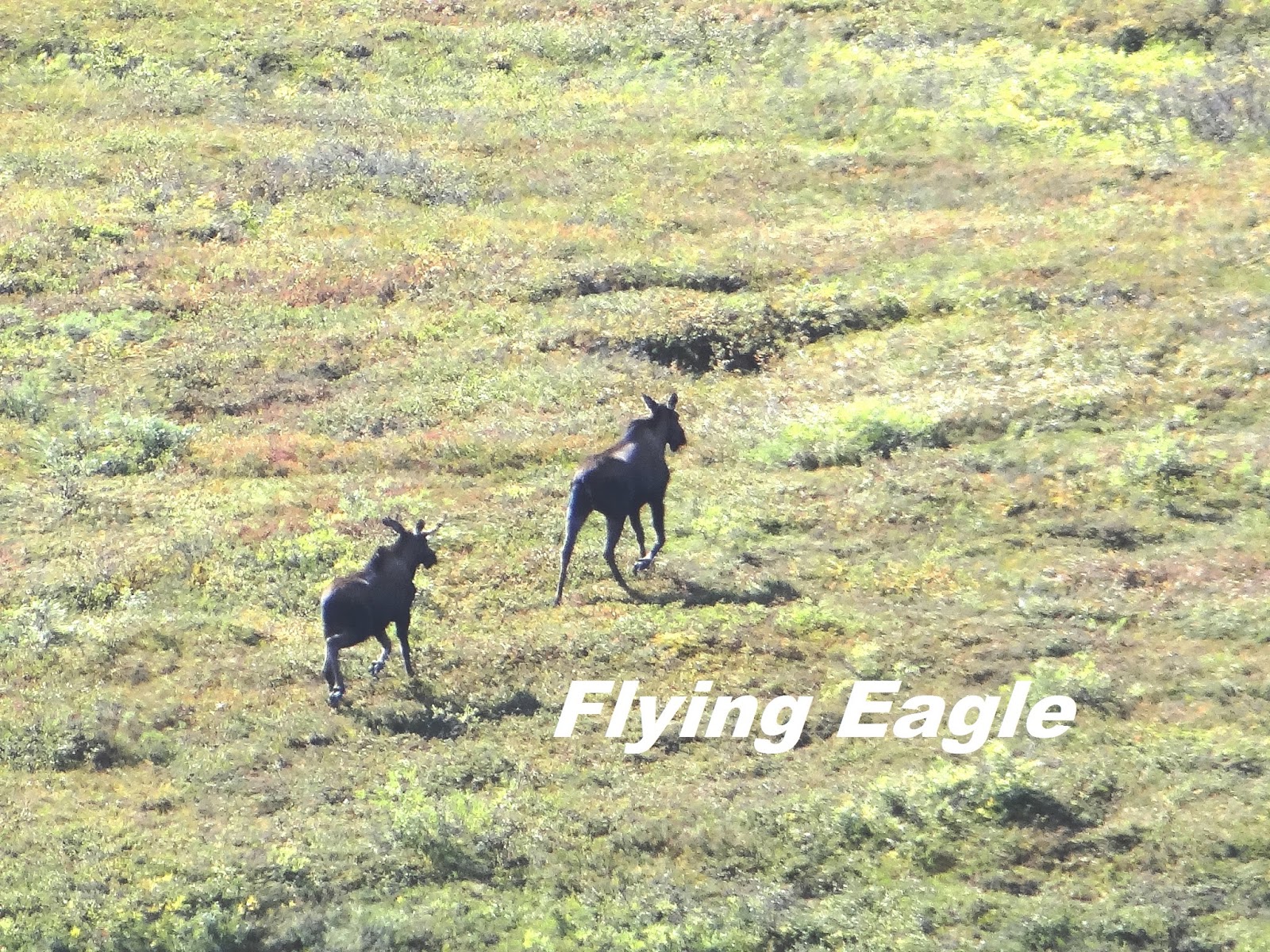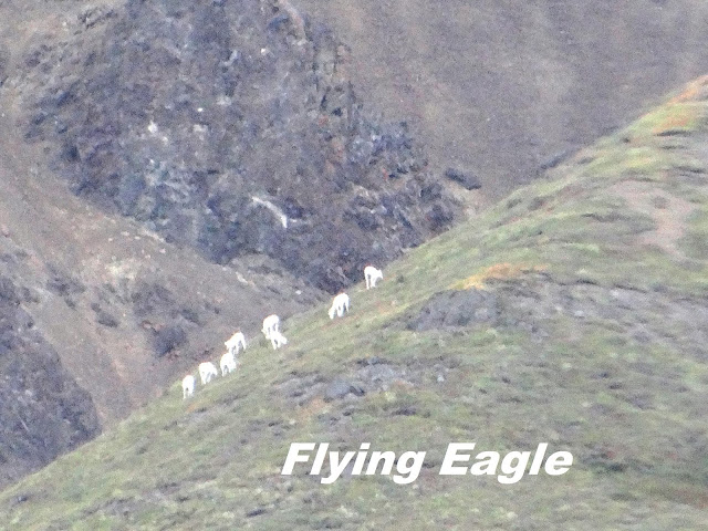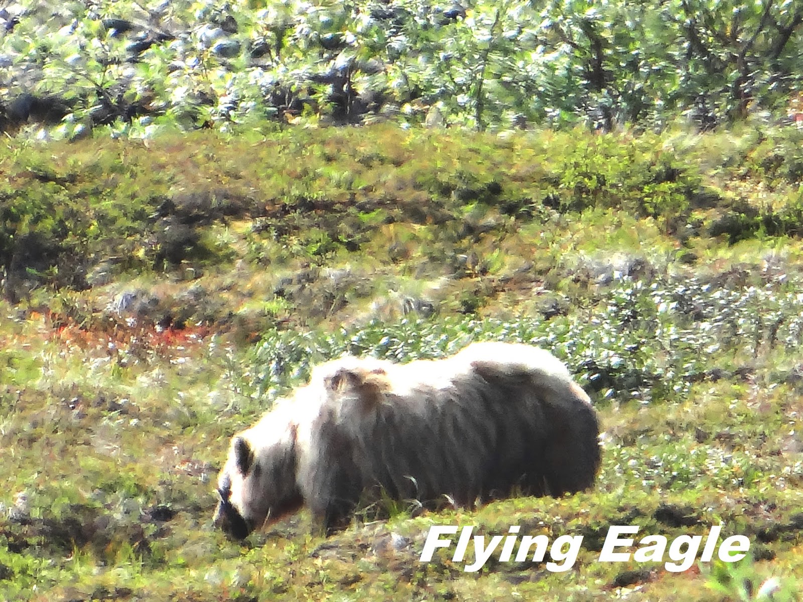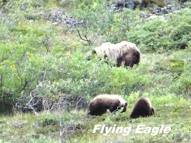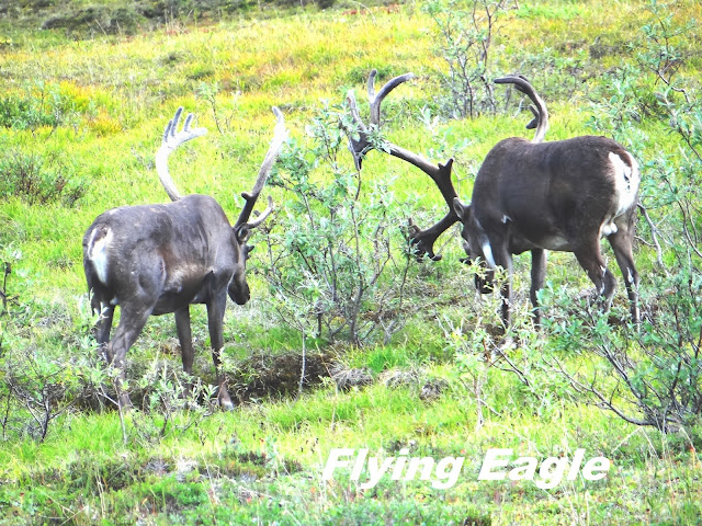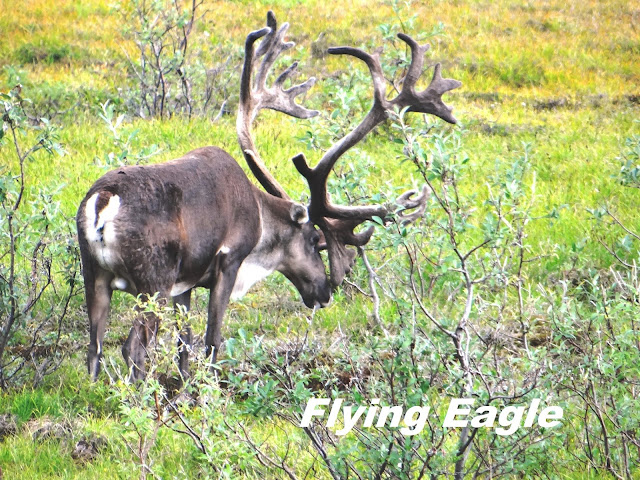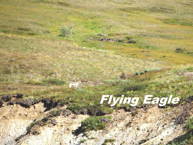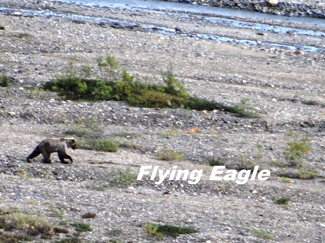 所有的乘客在巴士上都把守望相助的精神發揮到極致,凡是有人看到了什麼動靜,便大聲喊出幾點鐘方向和動物名稱,大家就朝那個方向找動物。於是我們就聽到此起彼落的呼喚聲,有的人還搞笑說什麼「兩點25分方向」,真是的!是要依時針還是分針啊?我和老公平時英文還算不錯,但去到那裡真覺英文不夠用,因為動物名稱我們只知道最常用的那些,當有人一直喊著caribou、caribou,我倆對望說,「caribou是什麼?」所以對我們來說,不僅像上了一堂生物課,也等於上了一堂英文課。另外值得一提的是,美國人很快就可以看到老遠之外的小動靜,眼力之好令人咋舌。我們猜想,他們不像我們因升學壓力個個都近視眼,而且他們比較多機會享受大自然,所以也算是訓練有素。
