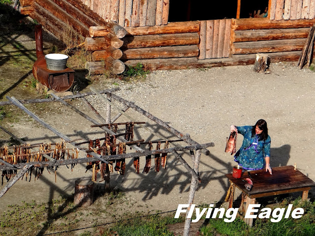 有些住戶也配合江輪做一些表演,否則光是房子也不太有看頭。我們行經一所訓練哈士奇犬的學校,一隊哈士奇犬便在訓犬員的指揮下,拉著車飛快跑了一圈。另外還有一位當地女孩,就在河邊的曬魚架旁示範如何醃製鮭魚,動作俐落純熟。