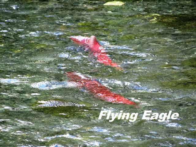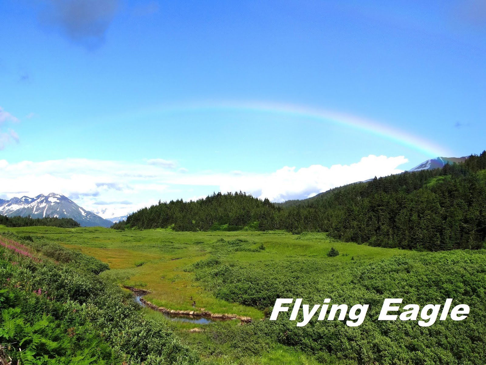 我們還經過一個Williwaw營地,那裡有個觀魚台架設在溪流之上,因為溪水十分清澈,溪流裡面有些什麼動靜都看得一清二楚,溪裡的魚兒還不少耶!車子開呀開,突然看見天際出現一抹淡淡的彩虹,趕緊下車拍照。彩虹雖然並非色澤鮮明,但襯著藍天綠地白雲,真是美不勝收!