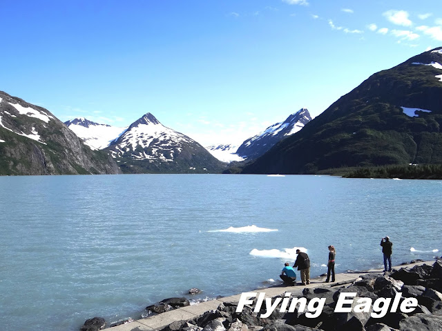 坐了回程的纜車回到平地,就和清幽美麗的Girdwood說再見了。我們開車往這晚要住宿的Seward港前進,中途再度經過六天前到訪過的Portage Lake。不論何時經過,湖四周的景色總如此引人入勝,叫人不得不佇足流連。Portage Lake是個冰河湖,它坐落的山谷被好幾條冰河簇擁著,所以就有源源不絕的冰河水注入湖中。這個湖就在Portage Glacier 公路旁,很容易看到,湖邊有大量停車位,讓旅人能歇歇腳。這裡還有個旅客中心,想就近觀賞冰河的人可在此報名參加短程的小遊輪之旅。
