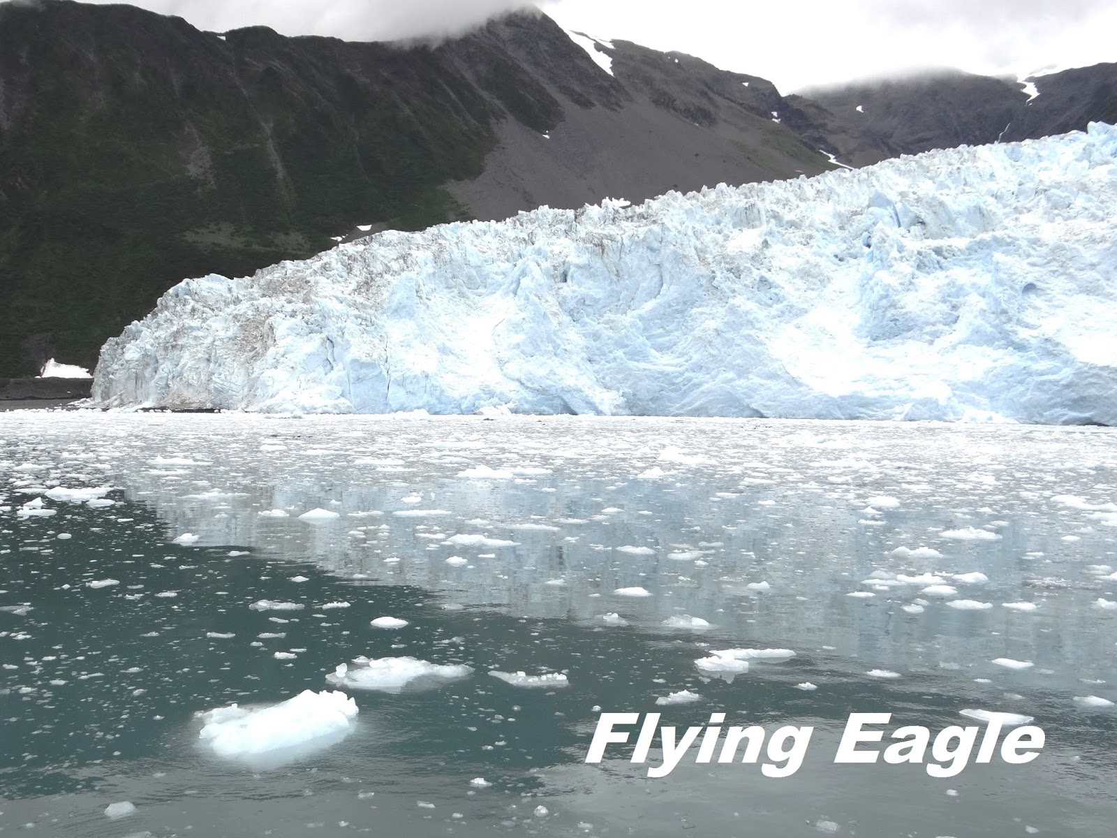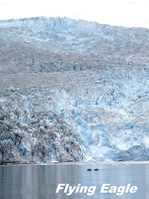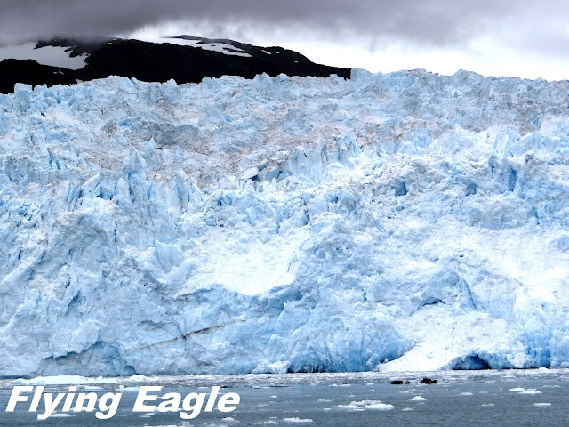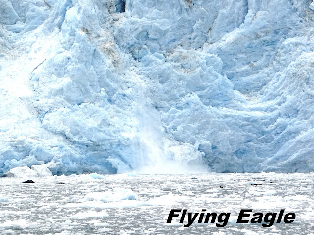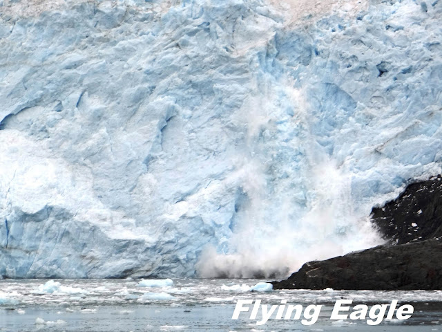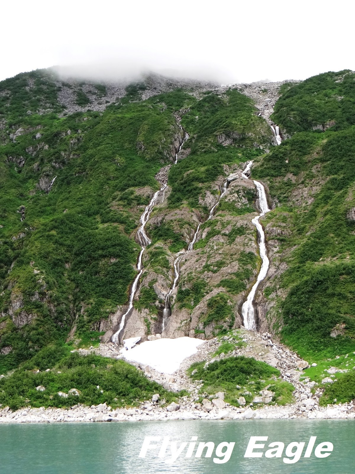 離開Aialik冰河時,突然看到好多海豹。牠們全都躺臥在浮冰上面,啥事都不做,一派悠哉。在充滿浮冰的海面上又有幾葉小舟,只不知在這種環境泛舟是什麼樣的感受。接著我們又看到由山上流瀉而下的冰河瀑布,其實用「流瀉」似乎不太正確,畢竟它們不是水,但流下的是冰又要用什麼來形容呢?真的詞窮啊!