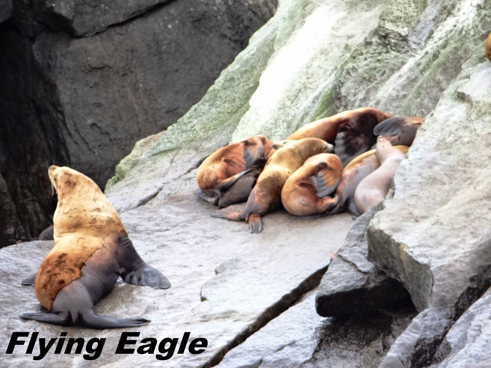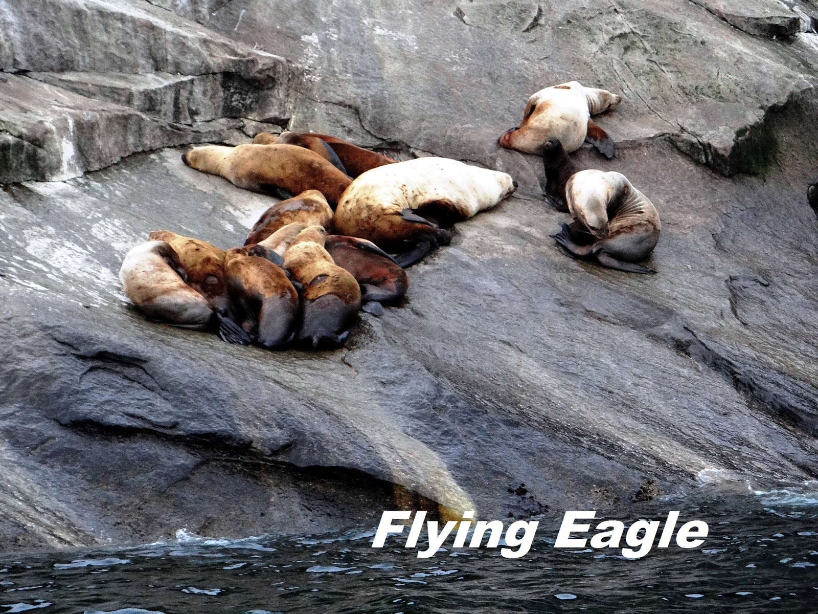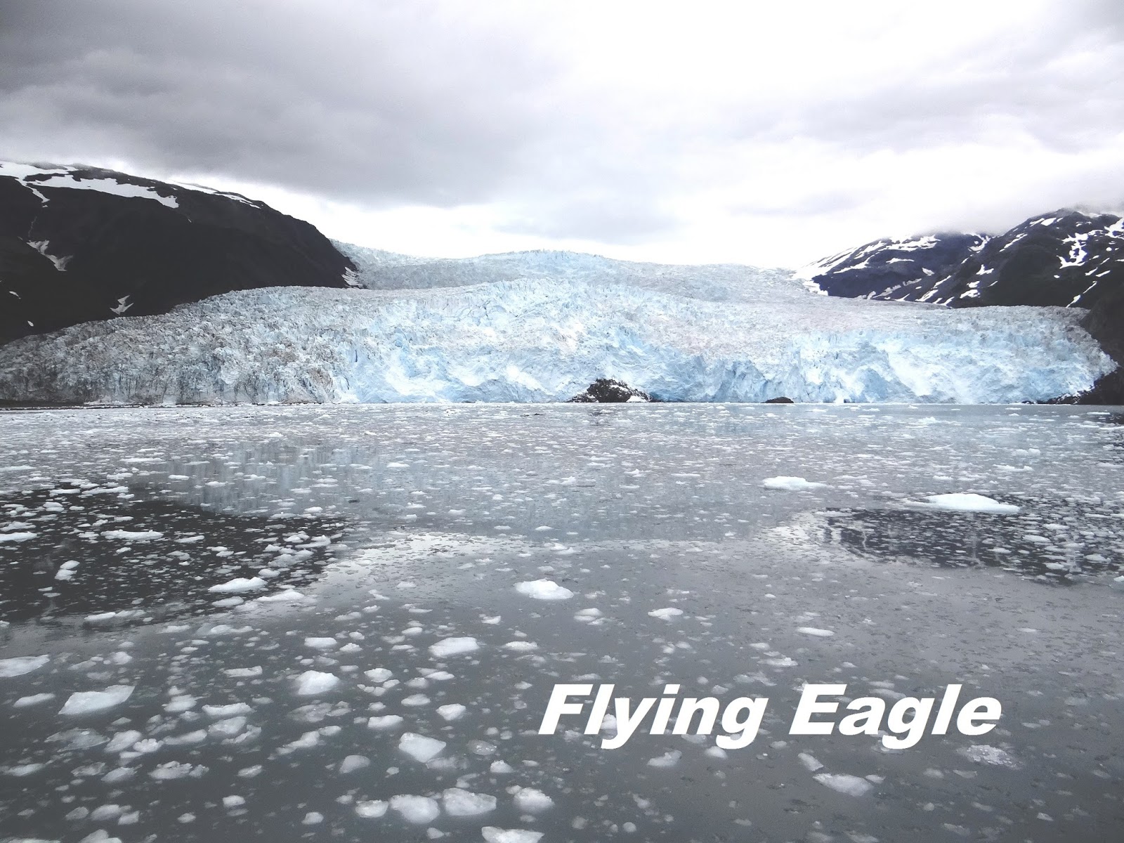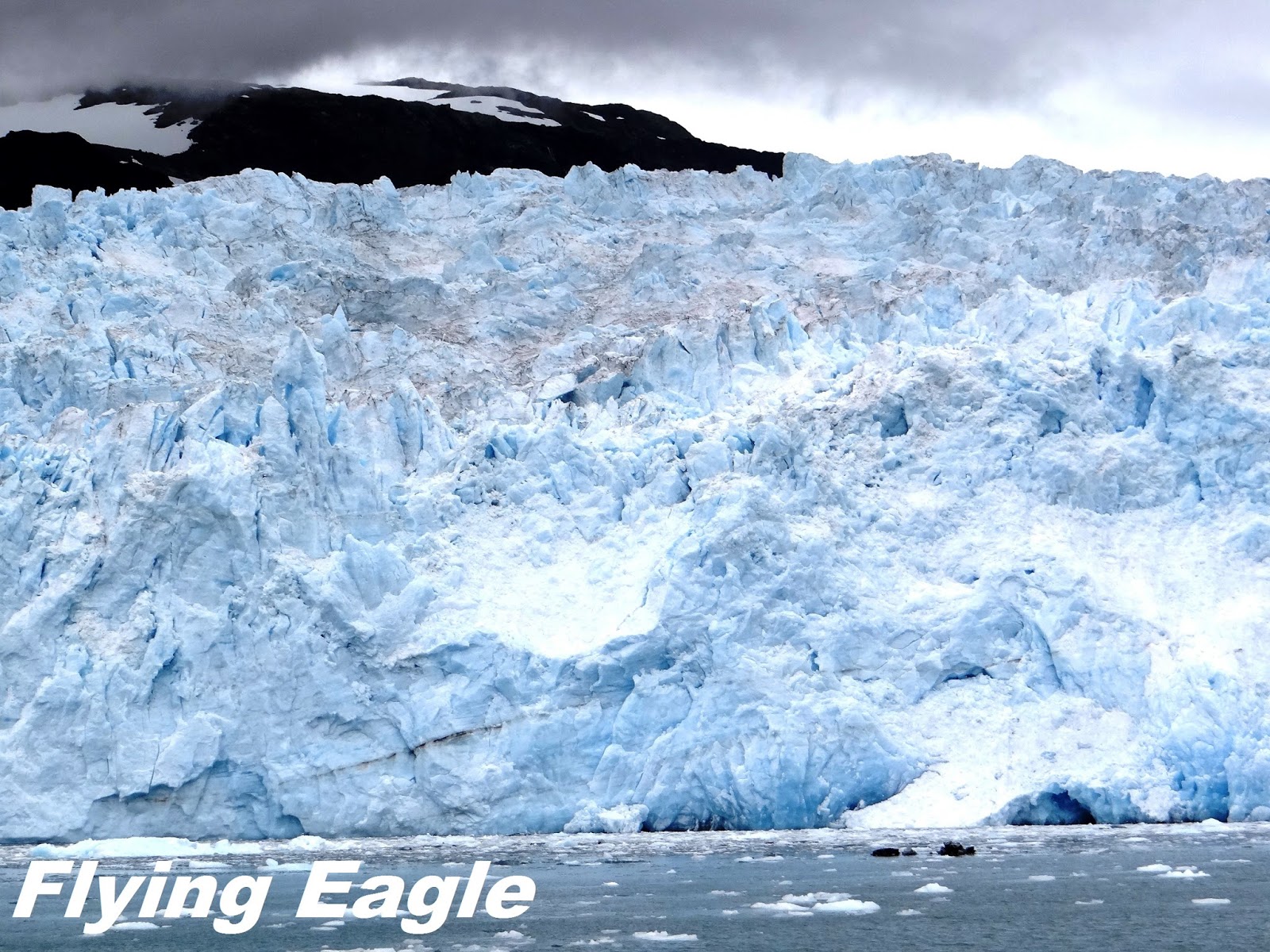 離開Aialik冰河時,突然看到好多海豹。牠們全都躺臥在浮冰上面,啥事都不做,一派悠哉。在充滿浮冰的海面上又有幾葉小舟,只不知在這種環境泛舟是什麼樣的感受。接著我們又看到由山上流瀉而下的冰河瀑布,其實用「流瀉」似乎不太正確,畢竟它們不是水,但流下的是冰又要用什麼來形容呢?真的詞窮啊!