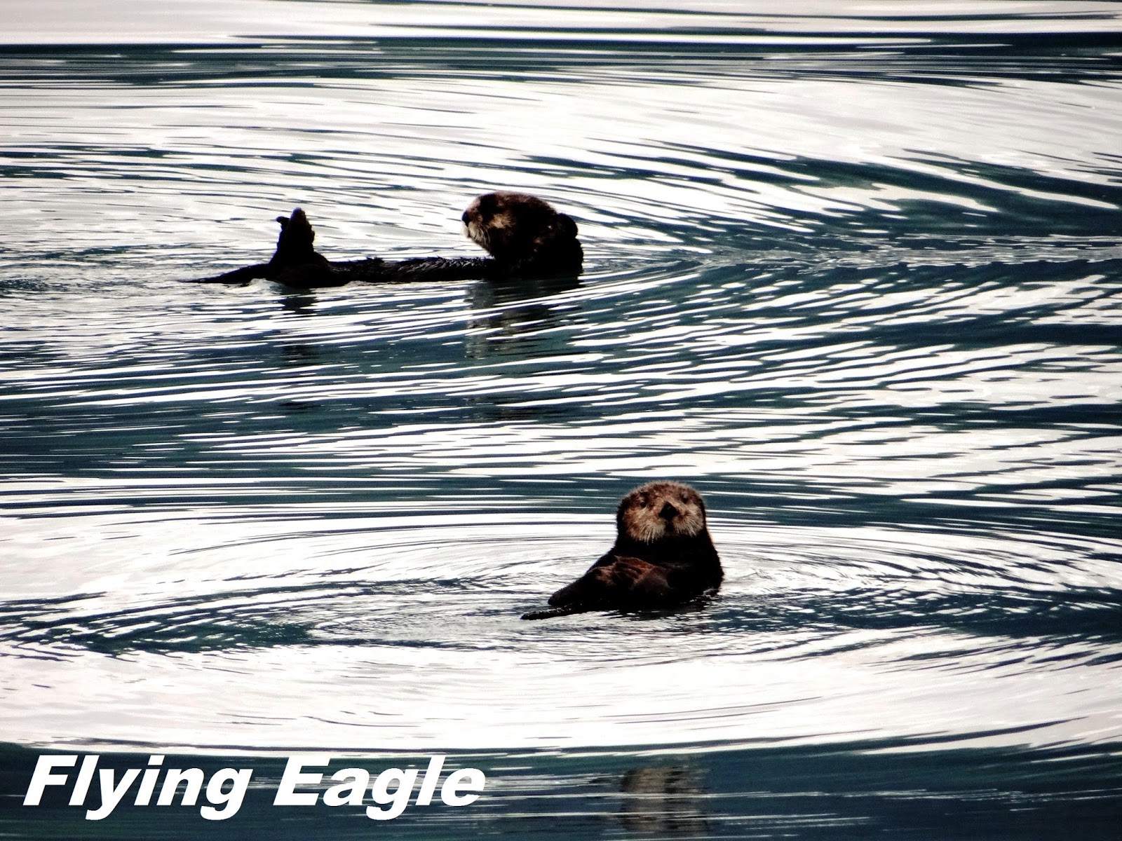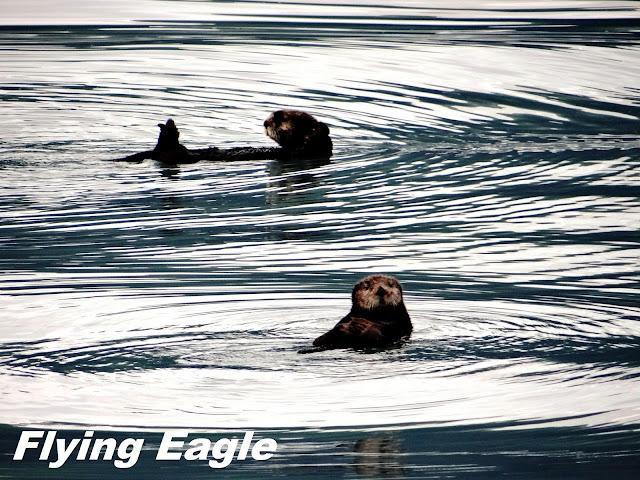 隨著船隻慢慢離開Seward港口,我們也看到了比較多的野生動物在自己的家園自在徜徉。先是兩隻戲水的海獺,似乎玩得不亦樂乎。再來又看到一隻白頭老鷹,孤傲地棲在高高的枝頭。回頭一望,有一些乾枯的樹雖然已無枝葉,但樹幹仍然屹立著,頗有一種遺世獨立的美感。我們打大老遠就可以看到巨大的Aialik冰河,等到船開近些,才發現有兩艘小舟划行在冰河前面,對比之下顯得格外渺小。