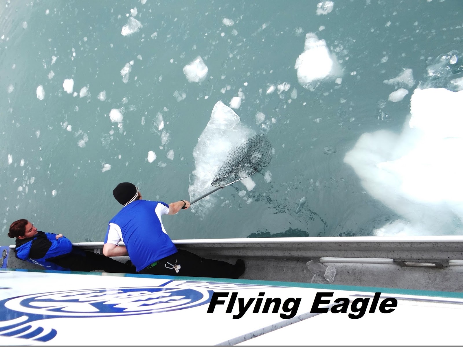 雖然這已不是我們的冰河初體驗,卻絲毫不減內心的震撼感。和碩大無朋的冰河面對面,免不了再次讚嘆上帝造物之奇妙細緻。之前寫冰河灣國家公園時提過,許多冰河往往在海平面之上發生崩裂的情形,崩裂的冰山便對海面造成巨大的衝擊,並濺起澎湃的浪花。我們在Kenai Fjords NP就多次目睹這樣的崩裂,只不過崩裂在瞬間發生,往往來不及用相機捕捉到關鍵時刻的畫面。我們的船員還特別從海面上撈起一塊浮冰,讓每個人都摸摸看質地與平時的冰有何不同。其實觸感似乎並無太大分別,但肉眼便可分辨兩種冰的成分有很大差異。