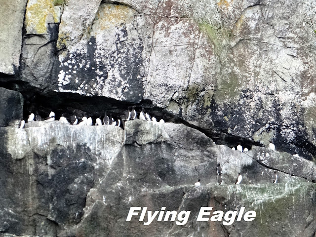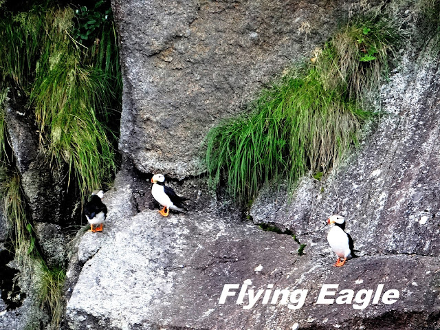 後來見到海面上有水柱噴出,我們就猜想是鯨魚,結果果然沒錯!我們也捕捉到幾個鯨魚尾巴的鏡頭。接著映入眼簾的是數以千計的海鳥棲息在岩石上,有的是一身黑,有的則是白灰兩色,但看不清楚確切的長相。有三隻海鸚(puffin)距離稍近,就讓我們得以仔細端詳,比對網上的資料,這三隻應是角海鸚,牠們的長相實在很像卡通裡的人物!